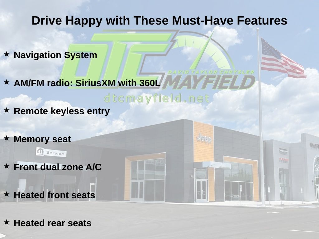 AM/FM radio: SiriusXM with 360L, Capri Leatherette Seats, Front dual zone A/C, Front fog lights, Heated front seats, Heated rear seats, Heated steering wheel, Memory seat, Navigation System, ParkView Rear Back-Up Camera, Power Liftgate, Remote keyless entry, 4-Wheel Disc Brakes, 6 Speakers, ABS brakes, Active Noise Control System, Air Conditioning, Alloy wheels, Anti-whiplash front head restraints, Audio memory, Auto High-beam Headlights, Automatic temperature control, Black Appearance Package, Brake assist, Bumpers: body-color, Compass, Delay-off headlights, Driver door bin, Driver vanity mirror, Dual front impact airbags, Dual front side impact airbags, Electronic Stability Control, Emergency communication system, Four wheel independent suspension, Front anti-roll bar, Front Bucket Seats, Front Center Armrest w/Storage, Front reading lights, Fully automatic headlights, Garage door transmitter, Gloss Black Exterior Accents, Heated door mirrors, Illuminated entry, Knee airbag, Low tire pressure warning, Model Year Tracking, Normal Duty Suspension, Occupant sensing airbag, Outside temperature display, Overhead airbag, Overhead console, Panic alarm, Passenger door bin, Passenger vanity mirror, Power door mirrors, Power driver seat, Power passenger seat, Power steering, Power windows, Quick Order Package 22E, Radio data system, Rear anti-roll bar, Rear reading lights, Rear window defroster, Rear window wiper, Security system, Speed control, Speed-Sensitive Wipers, Split folding rear seat, Spoiler, Steering wheel mounted audio controls, Tachometer, Telescoping steering wheel, Tilt steering wheel, Traction control, Trip computer, Turn signal indicator mirrors, Variably intermittent wipers, Voltmeter, Wheels: 18" x 8" Polished/Painted Aluminum, Wheels: 20" x 8.5" Gloss Black Painted Aluminum, AM/FM radio: SiriusXM with 360L, Capri Leatherette Seats, Front dual zone A/C, Front fog lights, Heated front seats, Heated rear seats, Heated steering wheel, Memory seat, Navigation System, ParkView Rear Back-Up Camera, Power Liftgate, Remote keyless entry. Price does not include Tax, Title, or License fees. Price may include Manufacturer Rebates and Incentives. Buyer must meet certain conditions to qualify when applicable. $1000 - Driveability / Automobility Program. Exp. 01/05/2026 $1250 - 2025 South BC Retail Bonus Cash . Exp. 01/05/2026 $1500 - 2025 National Stellantis Loyalty Retail Bonus Cash . Exp. 01/05/2026 $2250 - 2025 National Retail Bonus Cash . Exp. 01/05/2026 $500 - 2025 National 2025 First Responder Bonus Cash. Exp. 01/05/2026 $750 - 2025 South BC SFS Retail Bonus Cash. Exp. 01/05/2026