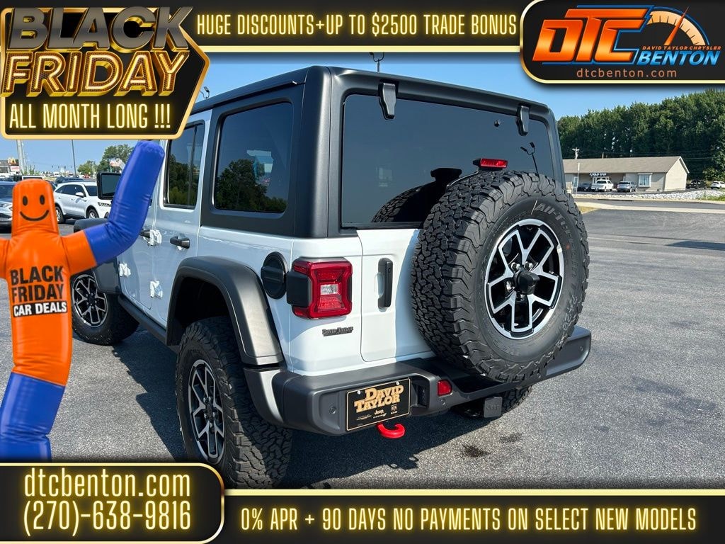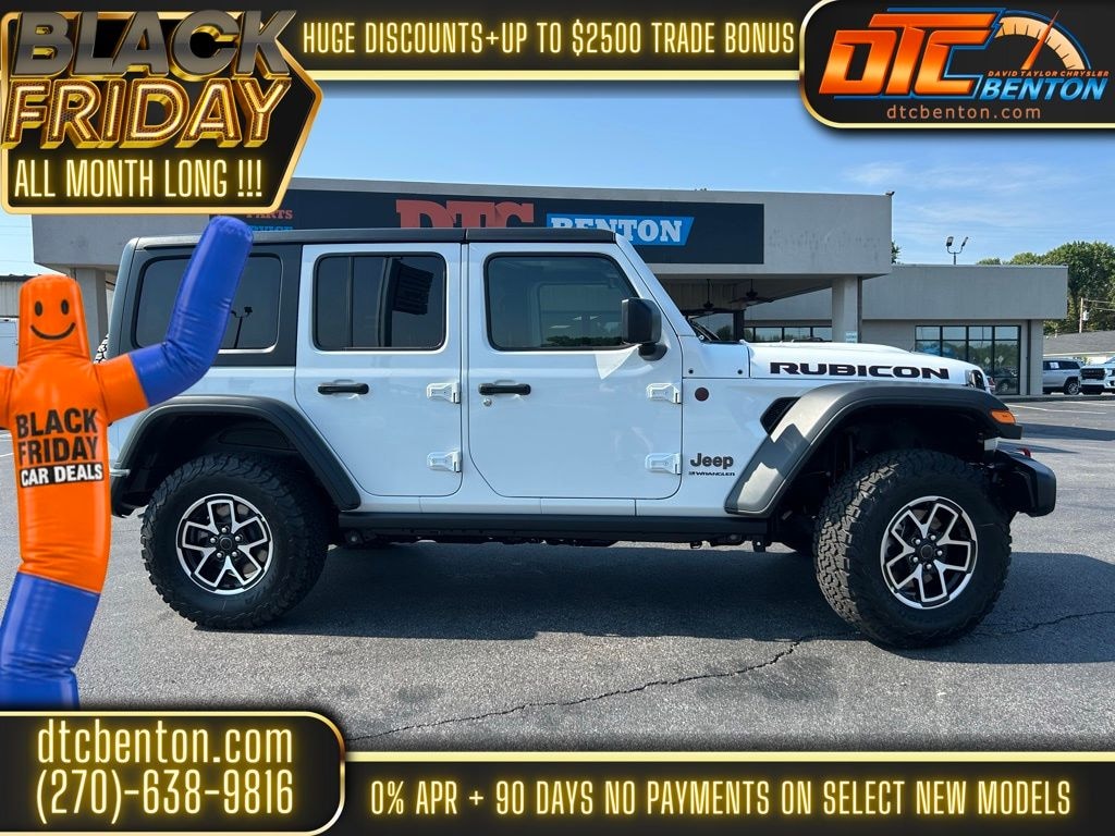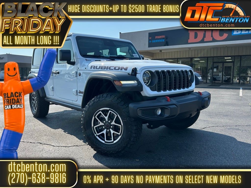 New Price! Bright White Clearcoat 2025 Jeep Wrangler Rubicon 4WD 8-Speed Automatic 2.0L I4 DOHC 12.3" Touchscreen Display, 4G LTE Wi-Fi Hot Spot, Apple CarPlay, Auto High Beam Headlamp Control, Auto-Dimming Rear-View Mirror, Blind Spot & Cross Path Detection, Class II Receiver Hitch, Cloth Low-Back Bucket Seats, Connected Travel & Traffic Services, Connectivity - US/Canada, Convenience Group, Fully automatic headlights, Google Android Auto, GPS Navigation, HD Radio, Heated Front Seats, Heated Steering Wheel, Integrated Off-Road Camera, Integrated Voice Command w/Bluetooth, ParkSense Rear Park Assist System, ParkView Rear Back-Up Camera, Power windows, Quick Order Package 22R Rubicon, Radio: Uconnect 5 Nav w/12.3" Display, Remote keyless entry, Safety Group, SiriusXM Radio Service, SiriusXM w/360L, Technology Group, Universal Garage Door Opener, Wheels: 17" x 7.5" Machined/Painted Black. Price does not include Tax, Title, or License fees. Price may include Manufacturer Rebates and Incentives. Buyer must meet certain conditions to qualify when applicable. $1500 - 2025 National Bonus Cash . Exp. 12/01/2025 $2500 - 2025 National Retail Bonus Cash . Exp. 12/01/2025