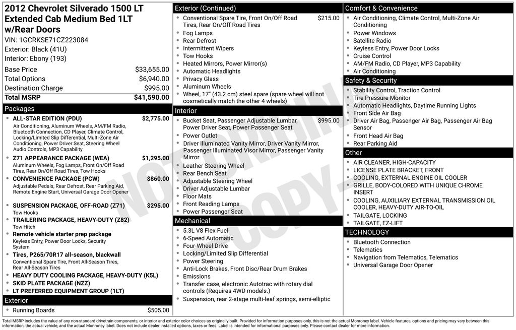 17" x 7.5" 5-Spoke Aluminum Wheels, 17" x 7.5" 6-Lug Chrome-Styled Steel Wheels, 18" x 8" Aluminum Wheels, 3.42 Rear Axle Ratio, 3" Round Chromed Tubular Assist Steps, 6 Speaker Audio System Feature, 6 Speakers, 6-Way Power Driver Seat Adjuster, 6-Way Power Front Passenger Seat Adjuster, ABS brakes, Air Conditioning, All-Star Edition, AM/FM radio: SiriusXM, AM/FM Stereo w/CD Player & MP3 Playback, AM/FM Stereo w/MP3 Compatible CD Player, Bluetooth® For Phone, Body-Colored Bodyside Moldings, Body-Colored Door Handles, Body-Colored Grille w/Unique Chrome Insert, Bodyside moldings, Bumpers: chrome, CD player, Chrome Grille Surround, Color-Keyed Carpeting w/Rubberized Vinyl Floormats, Compass, Convenience Package, Delay-off headlights, Driver & Front Passenger Illuminated Visor Mirrors, Driver door bin, Driver vanity mirror, Driver-Side Manual Lumbar Control Seat Adjuster, Dual front impact airbags, Dual front side impact airbags, Dual-Zone Automatic Climate Control, Electric Rear-Window Defogger, Electronic Autotrac Transfer Case, Electronic Stability Control, Emergency communication system: OnStar Directions & Connections, EZ-Lift Tailgate, Floor Console w/Dual Cup Holders, Front 40/20/40 Split-Bench Seat, Front anti-roll bar, Front Bucket Seats, Front Center Armrest w/Storage, Front Chrome Recovery Hooks, Front Halogen Fog Lamps, Front License Plate Bracket, Front reading lights, Front wheel independent suspension, Fully automatic headlights, Heated door mirrors, Heated Power-Adjustable Black Outside Mirrors, Heavy Duty Cooling Package, Heavy-Duty Air-to-Oil External Engine Oil Cooler, Heavy-Duty Auxiliary External Transmission Oil Cooler, Heavy-Duty Handling/Trailering Suspension Package, Heavy-Duty Rear Automatic Locking Differential, Heavy-Duty Trailering Package (Retail), Illuminated entry, Leather-Wrapped Steering Wheel, Locking Tailgate, Low tire pressure warning, LT1 Equipment Group, Occupant sensing airbag, Off-Road Suspension Package, Outside temperature display, Overhead airbag, Overhead console, Panic alarm, Passenger door bin, Passenger vanity mirror, Power Door Locks w/Remote Keyless Entry, Power door mirrors, Power steering, Power windows, Power Windows w/Driver Express-Down, Power-Adjustable Pedals For Accelerator & Brake, Premium Cloth Seat Trim, Radio data system, Rear Access Door Power Windows, Rear reading lights, Rear step bumper, Remote keyless entry, Remote Keyless Entry w/2 Transmitters, Remote Vehicle Starter System, Security system, SIRIUSXM Satellite Radio, Skid Plate Package, Solar-Ray Deep-Tinted Glass, Speed control, Split folding rear seat, Steering Wheel Mounted Audio Controls, Tachometer, Tilt steering wheel, Traction control, Ultrasonic Rear Parking Assist w/Audible Warning, Universal Home Remote, Variably intermittent wipers, Voltmeter, Z71 Appearance Package (Retail).