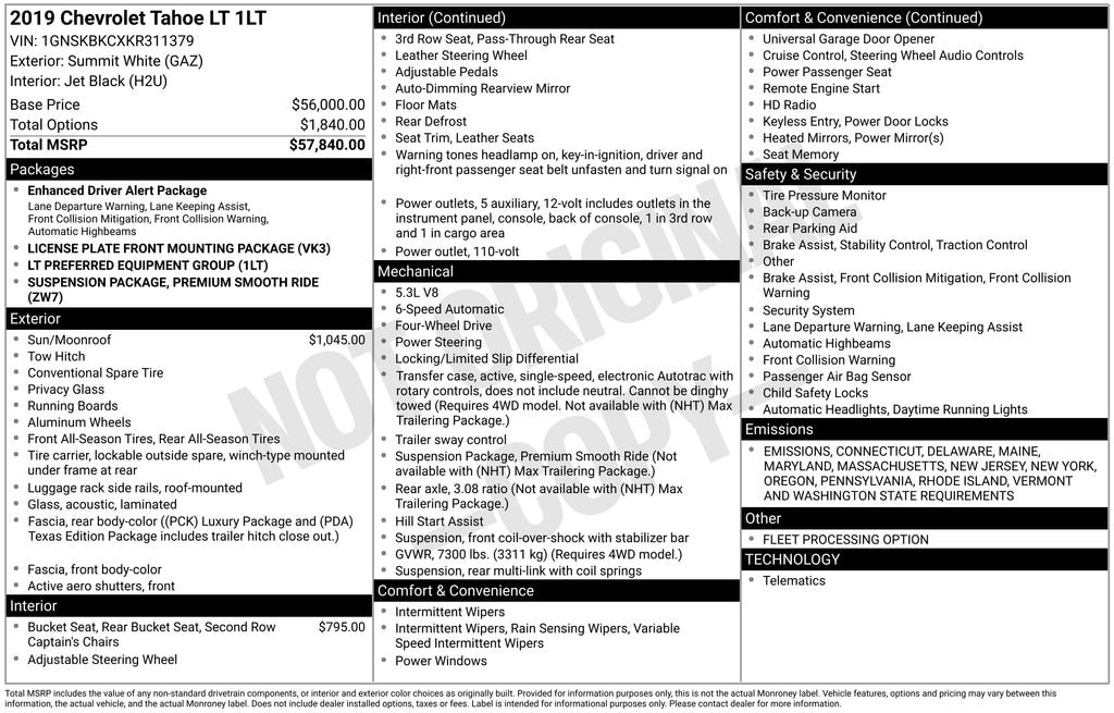 2019 Chevrolet Tahoe LT 4WD 6-Speed Automatic Electronic with Overdrive EcoTec3 5.3L V8 Summit White