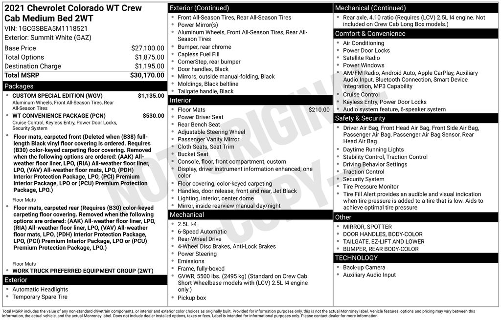1st & 2nd Row All-Weather Floor Liner (LPO), 4-Wheel Disc Brakes, 4.10 Rear Axle Ratio, 6 Speakers, 6-Speaker Audio System Feature, ABS brakes, Air Conditioning, AM/FM radio: SiriusXM, Apple CarPlay/Android Auto, Body-Color Door Handles, Bumpers: body-color, Custom Special Edition, Delay-off headlights, Driver 4-Way Power Seat Adjuster, Driver door bin, Dual front impact airbags, Dual front side impact airbags, Electronic Automatic Cruise Control, Electronic Stability Control, Extended Range Remote Keyless Entry, Exterior Parking Camera Rear, EZ-Lift & Lower Tailgate, Front anti-roll bar, Front Bucket Seats, Front Center Armrest, Front wheel independent suspension, Fully automatic headlights, Low tire pressure warning, Occupant sensing airbag, Outside Power-Adjustable Body-Color Mirrors, Overhead airbag, Passenger door bin, Passenger vanity mirror, Power driver seat, Power steering, Power windows, Preferred Equipment Group 2WT, Premium audio system: Chevrolet Infotainment 3, Radio data system, Radio: Chevrolet Infotainment 3 System, Rear Body-Color Bumper, Rear seat center armrest, Rear step bumper, Remote Locking Tailgate, SiriusXM Radio, Speed-sensing steering, Spotter Mirror, Tachometer, Tilt steering wheel, Traction control, Trip computer, Unauthorized Entry Theft-Deterrent System, Variably intermittent wipers, Vinyl Seat Trim, Wheels: 17" x 8" Ultra Silver Metallic Steel, Wheels: 18" x 8.5" Dark Argent Metallic Cast Alloy, WT Convenience Package.