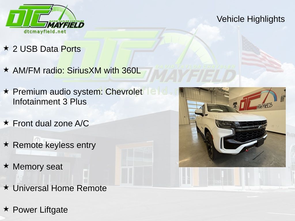 2 USB Data Ports, AM/FM radio: SiriusXM with 360L, Apple CarPlay/Android Auto, Front dual zone A/C, Heated Driver & Front Passenger Seats, Hitch Guidance w/Hitch View, Lane Change Alert w/Side Blind Zone Alert, Leather Seating Surfaces, Memory seat, Power Liftgate, Premium audio system: Chevrolet Infotainment 3 Plus, Remote keyless entry, Universal Home Remote, 10-Way Power Driver & Passenger Seat Adjusters, 1st & 2nd Row Color-Keyed Carpeted Floor Mats, 2-Speed Active Electronic AutoTrac Transfer Case, 2nd Row Pwr Release 60/40 Split-Folding Bench Seat, 3.23 Rear Axle Ratio, 3rd Row 60/40 Power-Folding Split-Bench, 3rd row seats: split-bench, 4-Wheel Disc Brakes, 9 Speakers, ABS brakes, Advanced Trailering Package, Advanced Trailering System, Air Conditioning, Air Ride Adaptive Suspension, Alloy wheels, Auto High-beam Headlights, Auto-Dimming Inside Rear-View Mirror, Auto-dimming Rear-View mirror, Automatic Heated Steering Wheel, Automatic temperature control, Black Tubular Assist Steps, Bose 9-Speaker Stereo Audio System Feature, Brake assist, Bright Front & Rear Door Sill Plates, Bumpers: body-color, Color-Keyed Carpeting Floor Covering, Compass, Delay-off headlights, Driver & Front Outboard Passenger Airbags, Driver Alert Package, Driver door bin, Driver vanity mirror, Dual front impact airbags, Dual front side impact airbags, Electronic Stability Control, Emergency communication system: OnStar and Chevrolet connected services capable, Enhanced Driver Information Center, Extra Capacity Cooling System, Floor Console w/Storage Area, Four wheel independent suspension, Front & Rear Park Assist, Front anti-roll bar, Front Bucket Seats, Front Center Armrest, Front High-Approach Angle Fascia, Front reading lights, Fully automatic headlights, Garage door transmitter, Hands-Free Rear Power Programmable Liftgate, HD Radio, HD Surround Vision, Heated 2nd Row Outboard Seats, Heated door mirrors, Heated front seats, Hill Descent Control, Illuminated entry, Infotainment Display, Integrated Trailer Brake Controller, Lane Keep Assist w/Lane Departure Warning, Leather steering wheel, Leather-Wrapped Steering Wheel, LED Daytime Running Lamps, License Plate Front Mounting Package, Low tire pressure warning, Luxury Package, Magnetic Ride Control Suspension, Max Trailering Package, Memory Settings, Memory Settings For Driver, Occupant sensing airbag, Off-Road Capability Package, Outside Heated Power-Adjustable Mirrors, Outside temperature display, Overhead airbag, Overhead console, Panic alarm, Passenger door bin, Passenger vanity mirror, Power door mirrors, Power driver seat, Power passenger seat, Power Release 2nd Row Bucket Seats, Power steering, Power Tilt & Telescopic Steering Column, Power windows, Preferred Equipment Group 2Z7, Premium Smooth Ride Suspension, Radio: Chevrolet Infotainment 3 Plus System, Rain sensing wipers, Rear air conditioning, Rear anti-roll bar, Rear Cross Traffic Alert, Rear Pedestrian Alert, Rear reading lights, Rear seat center armrest, Rear window defroster, Rear window wiper, Red Recovery Hooks, Remote Start, Roof rack: rails only, Security system, SiriusXM Radio w/360L, Speed control, Speed-sensing steering, Split folding rear seat, Spoiler, Steering wheel mounted audio controls, Tachometer, Telescoping steering wheel, Tilt steering wheel, Traction control, Trip computer, Variably intermittent wipers, Voltmeter, Wheels: 20" x 9" Machined Aluminum, Z71 Off-Road Package, 2 USB Data Ports, AM/FM radio: SiriusXM with 360L, Apple CarPlay/Android Auto, Front dual zone A/C, Heated Driver & Front Passenger Seats, Hitch Guidance w/Hitch View, Lane Change Alert w/Side Blind Zone Alert, Leather Seating Surfaces, Memory seat, Power Liftgate, Premium audio system: Chevrolet Infotainment 3 Plus, Remote keyless entry, Universal Home Remote.