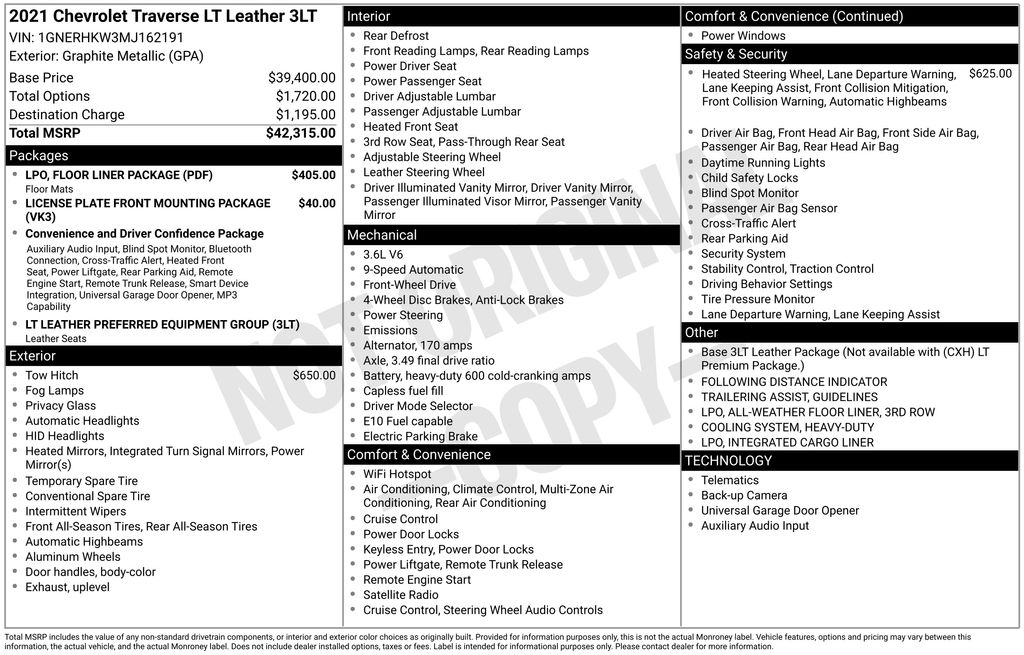 2021 Chevrolet Traverse LT Leather FWD 9-Speed Automatic 3.6L V6 SIDI VVT Graphite Metallic