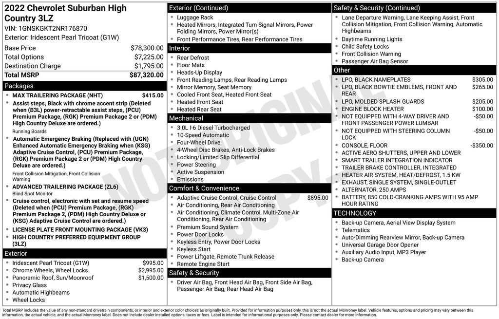 1.5 kW Heater/Defrost Air System, 10 Speakers, 15" Diagonal Multi-Color Head-Up Display, 1st & 2nd Row Color-Keyed Carpeted Floor Mats, 2-Speed Active Electronic AutoTrac Transfer Case, 250 Amps Alternator, 3.23 Rear Axle Ratio, 3rd Row 60/40 Power-Folding Split-Bench, 3rd row seats: split-bench, 4-Wheel Disc Brakes, 850 Cold-Cranking Amps Battery, ABS brakes, Adaptive Cruise Control, Adaptive suspension, Advanced Trailering Package, Air Conditioning, Alloy wheels, AM/FM radio: SiriusXM with 360L, Apple CarPlay/Android Auto, Auto High-beam Headlights, Auto-dimming door mirrors, Auto-dimming Rear-View mirror, Auto-leveling suspension, Automatic Stop/Start, Automatic temperature control, Black Name Plates (LPO), Bose 10-Speaker Surround w/CenterPoint, Brake assist, Bright Front & Rear Door Sill Plates, Bumpers: body-color, Chrome Door Handles w/Body-Color Strip, Color-Keyed Carpeting Floor Covering, Compass, Delay-off headlights, Diesel B20 Fuel, Driver & Front Outboard Passenger Airbags, Driver door bin, Driver vanity mirror, Dual Exhaust System, Dual front impact airbags, Dual front side impact airbags, Dual-Pane Power Panoramic Sunroof, Electronic Stability Control, Emergency communication system: OnStar and Chevrolet connected services capable, Engine Block Heater, Enhanced Automatic Emergency Braking, Enhanced Driver Information Center, Extra Capacity Cooling System, Floor Console, Floor Console w/Storage Area, Four wheel independent suspension, Front & Rear Black Bowtie Emblems (LPO), Front & Rear Park Assist, Front anti-roll bar, Front Bucket Seats, Front Center Armrest, Front dual zone A/C, Front reading lights, Fully automatic headlights, Garage door transmitter, Hands-Free Rear Power Programmable Liftgate, HD Surround Vision, Heads-Up Display, Heated & Ventilated Driver & Front Passenger Seats, Heated 2nd Row Outboard Seats, Heated door mirrors, Heated Driver & Front Passenger Seats, Heated front seats, Heated rear seats, Heated Steering Wheel, Heated steering wheel, Hill Descent Control, Hitch Guidance w/Hitch View, Illuminated entry, Infotainment Display, Inside Rearview Auto-Dimming Rear Camera Mirror, Integrated Trailer Brake Controller, Lane Change Alert w/Side Blind Zone Alert, Leather steering wheel, Leather-Wrapped Steering Wheel, LED Daytime Running Lamps, License Plate Front Mounting Package, Low tire pressure warning, Magnetic Ride Control Suspension, Max Trailering Package, Memory seat, Memory Settings, Molded Splash Guards, Navigation System, Not Equipped w/4-Way Driver & Fr Pass Pwr Lumbar, Not Equipped w/Steering Column Lock, Occupant sensing airbag, Outside Heated Power-Adjustable Mirrors, Outside temperature display, Overhead airbag, Overhead console, Panic alarm, Passenger door bin, Passenger vanity mirror, Perforated Leather Seating Surfaces, Power door mirrors, Power driver seat, Power Liftgate, Power passenger seat, Power Release 2nd Row Bucket Seats, Power steering, Power Tilt & Telescopic Steering Column, Power windows, Preferred Equipment Group 3LZ, Premium audio system: Chevrolet Infotainment 3 Premium, Radio: Chevrolet Infotainment 3 Premium System, Rain sensing wipers, Rear air conditioning, Rear anti-roll bar, Rear Camera Mirror Washer, Rear Cross Traffic Alert, Rear Pedestrian Alert, Rear reading lights, Rear window defroster, Rear window wiper, Remote keyless entry, Remote Start, Roof rack: rails only, Safety Alert Seat, Security system, Single Outlet Exhaust, SiriusXM Radio w/360L, Smart Trailer Integration Indicator, Speed control, Speed-sensing steering, Split folding rear seat, Spoiler, Start/Stop System Disable Button, Steering wheel memory, Steering wheel mounted audio controls, Tachometer, Telescoping steering wheel, Tilt steering wheel, Traction control, Trailer Side Blind Zone Alert, Trip computer, Turn signal indicator mirrors, Universal Home Remote, Upper & Lower Active Aero Shutters,