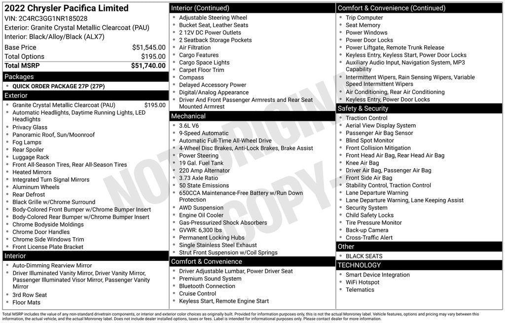 2022 Chrysler Pacifica Limited AWD 9-Speed 948TE Automatic 3.6L V6 24V VVT Granite Crystal Metallic Clearcoat