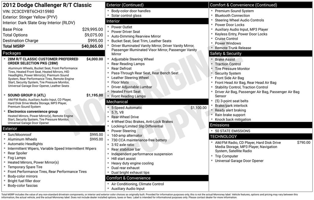 2012 Dodge Challenger R/T RWD 5-Speed Automatic HEMI 5.7L V8 Multi Displacement VVT Stinger Yellow Clearcoat