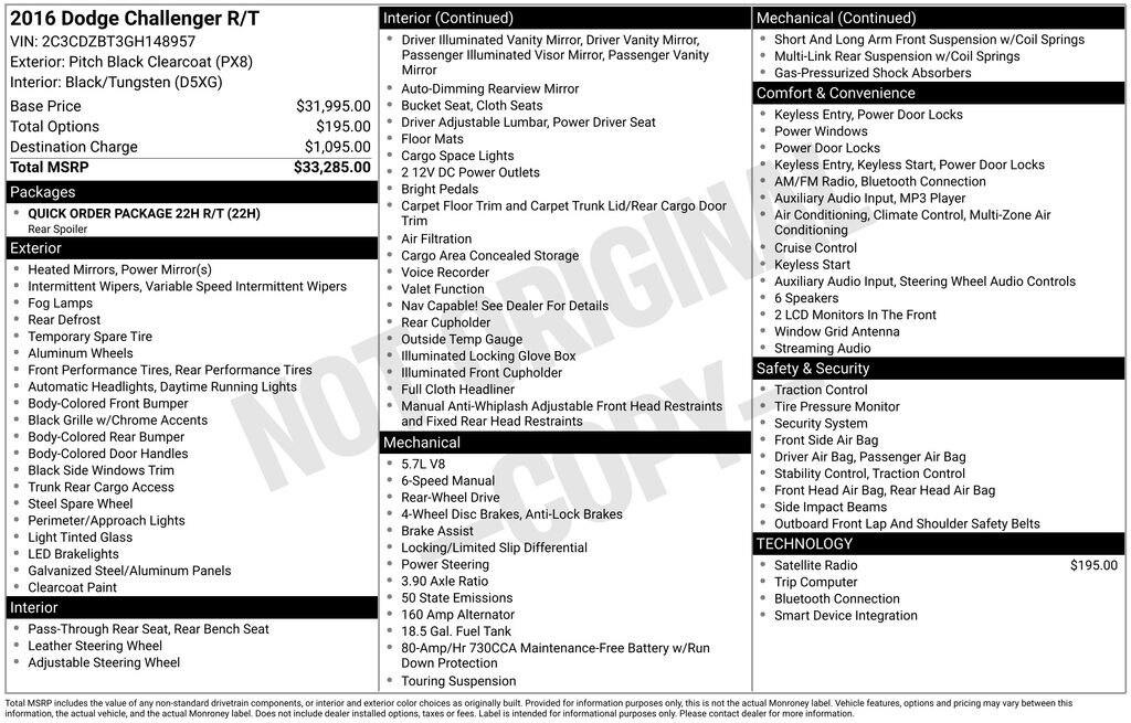 2016 Dodge Challenger R/T RWD Tremec 6-Speed Manual HEMI 5.7L V8 VVT Pitch Black Clearcoat