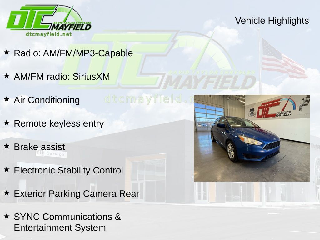 Air Conditioning, AM/FM radio: SiriusXM, Brake assist, Cloth Front Bucket Seats, Compass, Electronic Stability Control, Exterior Parking Camera Rear, Illuminated entry, Radio: AM/FM/MP3-Capable, Remote keyless entry, SYNC Communications & Entertainment System, Wheels: 16" Sparkle Silver Painted Aluminum, 6 Speakers, ABS brakes, Alloy wheels, Bumpers: body-color, Delay-off headlights, Driver door bin, Driver vanity mirror, Dual front impact airbags, Dual front side impact airbags, Emergency communication system, Equipment Group 200A, Four wheel independent suspension, Front anti-roll bar, Front Bucket Seats, Front Center Armrest, Front reading lights, Fully automatic headlights, Knee airbag, Low tire pressure warning, Occupant sensing airbag, Outside temperature display, Overhead airbag, Overhead console, Panic alarm, Passenger door bin, Passenger vanity mirror, Power door mirrors, Power steering, Power windows, Radio data system, Rear anti-roll bar, Rear window defroster, Speed control, Split folding rear seat, Steering wheel mounted audio controls, Tachometer, Telescoping steering wheel, Tilt steering wheel, Traction control, Trip computer, Variably intermittent wipers, Air Conditioning, AM/FM radio: SiriusXM, Brake assist, Cloth Front Bucket Seats, Compass, Electronic Stability Control, Exterior Parking Camera Rear, Illuminated entry, Radio: AM/FM/MP3-Capable, Remote keyless entry, SYNC Communications & Entertainment System, Wheels: 16" Sparkle Silver Painted Aluminum.