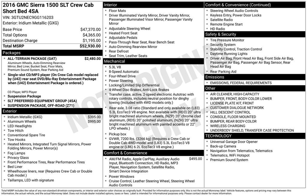 10-Way Power Driver's Seat Adjuster, 110-Volt AC Power Outlet, 150 Amp Alternator, 1st & 2nd Row Color-Keyed Carpeted Floor Mats, 2-Speed Active Electronic AutoTrac Transfer Case, 4-Wheel Disc Brakes, 4.2" Diagonal Color Display Driver Info Center, 40/20/40 Front Split Bench Seat, 6 Speakers, 6-Speaker Audio System, ABS brakes, Adjustable pedals, Air Conditioning, All-Terrain Package, Alloy wheels, AM/FM radio: SiriusXM, Auto-dimming door mirrors, Auto-Dimming Inside Rear-View Mirror, Auto-dimming Rear-View mirror, Automatic temperature control, Auxiliary External Transmission Oil Cooler, Body Color Front Bumper, Body Color Rear Bumper w/Cornersteps, Bodyside moldings, Bose Speaker System, Brake assist, Bumpers: chrome, CD player, Chrome Bodyside Moldings, Chrome Door Handles, Chrome Mirror Caps, Color-Keyed Carpeting w/Rubberized Vinyl Floor Mats, Compass, Deep-Tinted Glass, Delay-off headlights, Driver & Front Passenger Illuminated Vanity Mirrors, Driver door bin, Driver vanity mirror, Dual front impact airbags, Dual front side impact airbags, Dual-Zone Automatic Climate Control, Electric Rear-Window Defogger, Electronic Stability Control, Emergency communication system: OnStar Guidance, Exterior Parking Camera Rear, EZ Lift & Lower Tailgate, Floor Mounted Console, Front anti-roll bar, Front Center Armrest w/Storage, Front dual zone A/C, Front fog lights, Front Frame-Mounted Black Recovery Hooks, Front Full Feature Power Reclining Bucket Seats, Front License Plate Kit, Front reading lights, Front wheel independent suspension, Fully automatic headlights, Garage door transmitter: HomeLink, HD Radio, Heated door mirrors, Heated Driver & Front Passenger Seats, Heated front seats, Heavy Duty Suspension, Heavy-Duty Rear Locking Differential, High-Performance LED Headlamps, Hill Descent Control, Illuminated entry, Leather Appointed Seat Trim, Leather Wrapped Steering Wheel w/Cruise Controls, LED Cargo Box Lighting, LED Tailamps w/Signature, Low tire pressure warning, Manual Tilt/Telescoping Steering Column, Memory seat, Occupant sensing airbag, Off-Road Suspension Package, OnStar 6 Month Guidance Plan, OnStar w/4G LTE, Outside temperature display, Overhead airbag, Overhead console, Panic alarm, Passenger door bin, Passenger vanity mirror, Power Adjustable Pedals, Power door mirrors, Power driver seat, Power Folding & Adjustable Heated Outside Mirrors, Power passenger seat, Power steering, Power windows, Power Windows w/Driver Express Up & Down, Preferred Equipment Group 4SA, Premium audio system: IntelliLink, Radio data system, Radio: AM/FM Stereo w/8" Diagonal Color Touch Nav., Radio: AM/FM Stereo w/8" Diagonal Color Touch Screen, Rear 60/40 Folding Bench Seat (Folds Up), Rear reading lights, Rear seat center armrest, Rear step bumper, Rear Vision Camera w/Dynamic Guide Lines, Rear Wheelhouse Liners, Rear window defroster, Remote Keyless Entry, Remote keyless entry, Remote Vehicle Starter System, Security system, Single Slot CD/MP3 Player, SiriusXM Satellite Radio, Speed control, Speed-sensing steering, Split folding rear seat, Spray-On Pickup Box Bed Liner, Steering Wheel Audio Controls, Steering wheel mounted audio controls, Tachometer, Telescoping steering wheel, Theft Deterrent System (Unauthorized Entry), Thin Profile LED Front Fog Lamps, Tilt steering wheel, Traction control, Trailering Equipment, Trip computer, Turn signal indicator mirrors, Ultrasonic Rear Park Assist, Unique Body Color Grille Surround w/Chrome Accents, Universal Home Remote, Variably intermittent wipers, Voltmeter, Wheels: 18" x 8.5" Bright Machined Aluminum, Wheels: 18" x 8.5" Polished Aluminum, Wheels: 20" x 9" Ultra Bright Machined Alum., Wireless Charging.
