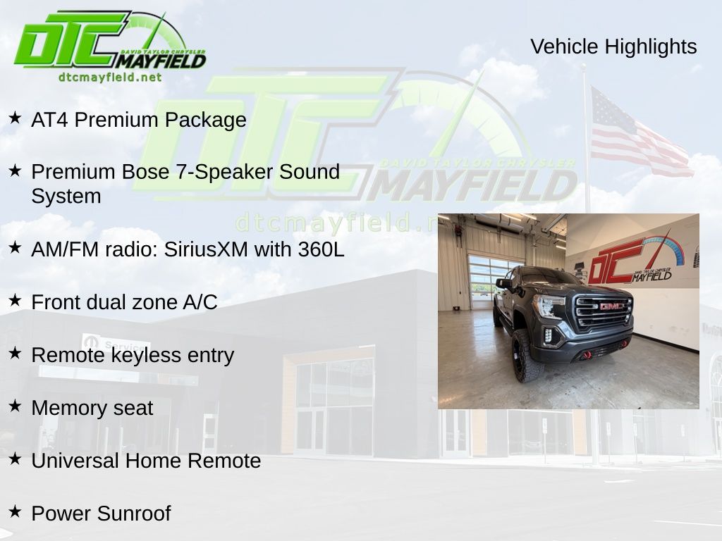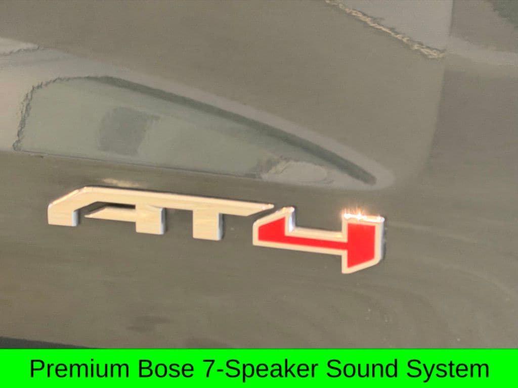 2 USB Ports, 4G LTE Wi-Fi Hotspot Capable, AM/FM radio: SiriusXM with 360L, Apple CarPlay/Android Auto, AT4 Premium Package, Front dual zone A/C, Front fog lights, Heated Driver & Front Outboard Passenger Seating, Lane Change Alert w/Side Blind Zone Alert, Memory seat, Perforated Leather-Appointed Front Seat Trim, Power Sunroof, Premium Bose 7-Speaker Sound System, Red Recovery Hooks, Remote keyless entry, Universal Home Remote, Ventilated Driver & Front Passenger Seats, Wireless Charging, 10-Way Power Driver Seat Adjuster w/Lumbar, 10-Way Power Passenger Seat Adjuster w/Lumbar, 12-Volt Rear Auxiliary Power Outlet, 120-Volt Bed Mounted Power Outlet, 120-Volt Instrument Panel Power Outlet, 170 Amp Alternator, 18" x 8.5" Machined Aluminum Wheels, 2 USB Ports (1st Row), 220 Amp Alternator, 3.23 Rear Axle Ratio, 4-Wheel Disc Brakes, 4.2" Diagonal Color Display Driver Info Center, 6 Speakers, 6-Speaker Audio System Feature, ABS brakes, Air Conditioning, Alloy wheels, AT4 High Clearance Step (LPO), AT4 Preferred Package, Auto-dimming door mirrors, Auto-dimming Rear-View mirror, Auto-Locking Rear Differential, Automatic temperature control, Auxiliary External Transmission Oil Cooler, Body-Color Surround Grille, Brake assist, Bumpers: body-color, Color-Keyed Carpeting Floor Covering, Compass, Deep-Tinted Glass, Delay-off headlights, Driver Alert Package I, Driver door bin, Driver Memory, Driver vanity mirror, Dual front impact airbags, Dual front side impact airbags, Electric Rear-Window Defogger, Electrical Lock Control Steering Column, Electronic Stability Control, Engine Block Heater, Floor-Mounted Center Console, Front anti-roll bar, Front Bucket Seats, Front Center Armrest, Front License Plate Kit, Front Prem Floor Liners w/Removable Carpet Insert, Front reading lights, Front wheel independent suspension, Fully automatic headlights, GMC Connected Access Capable, HD Rear Vision Camera, Heated door mirrors, Heated front seats, Heated steering wheel, Heavy-Duty Air Filter, Hill Descent Control, Hitch Guidance, Hitch Guidance w/Hitch View, Illuminated entry, In-Vehicle Trailering App, Integrated Trailer Brake Controller, Keyless Open & Start, LED Cargo Area Lighting, Low tire pressure warning, Manual Tilt-Wheel & Telescoping Steering Column, Occupant sensing airbag, Off-Road Suspension, OnStar & GMC Connected Services Capable, Outside temperature display, Overhead airbag, Overhead console, Panic alarm, Passenger door bin, Passenger vanity mirror, Perimeter Lighting, Power Door Locks, Power door mirrors, Power driver seat, Power Front Passenger Windows w/Express Up/Down, Power Front Windows w/Driver Express Up/Down, Power passenger seat, Power Rear Windows w/Express Down, Power Sliding Rear Window w/Rear Defogger, Power steering, Power windows, Preferred Equipment Group 4SB, Premium audio system: GMC Infotainment System, ProGrade Trailering System, Radio data system, Radio: Premium GMC Infotainment Sys w/Multi-Touch, Radio: Premium GMC Infotainment Sys w/Navigation, Rear Cross Traffic Alert, Rear Dual USB Charging-Only Ports, Rear Prem Floor Liners w/Removable Carpet Insert, Rear reading lights, Rear seat center armrest, Rear step bumper, Rear Wheelhouse Liners, Rear window defroster, Remote Vehicle Starter System, Security system, SiriusXM w/360L, Speed control, Speed-sensing steering, Split folding rear seat, Spray-On Pickup Bed Liner w/AT4 Logo, Steering Wheel Audio Controls, Steering wheel mounted audio controls, Tachometer, Telescoping steering wheel, Theft Deterrent System (Unauthorized Entry), Tilt steering wheel, Traction control, Trailering Package, Trip computer, Ultrasonic Front & Rear Park Assist, Variably intermittent wipers, Ventilated front seats, Voltmeter, 2 USB Ports, 4G LTE Wi-Fi Hotspot Capable, AM/FM radio: SiriusXM with 360L, Apple CarPlay/Android Auto, AT4 Premium Package, Front dual zone A/C, Front fog lights, Heated Driver & F