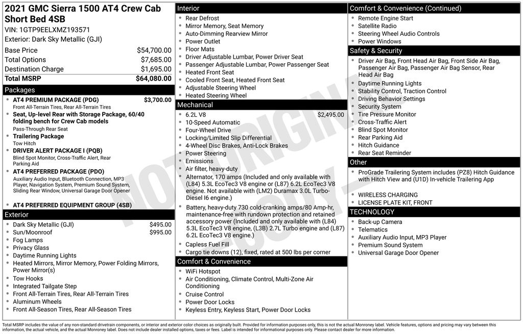 10-Way Power Driver Seat Adjuster w/Lumbar, 10-Way Power Passenger Seat Adjuster w/Lumbar, 12-Volt Rear Auxiliary Power Outlet, 120-Volt Bed Mounted Power Outlet, 120-Volt Instrument Panel Power Outlet, 170 Amp Alternator, 18" x 8.5" Machined Aluminum Wheels, 2 USB Ports, 2 USB Ports (1st Row), 220 Amp Alternator, 3.23 Rear Axle Ratio, 4-Wheel Disc Brakes, 4.2" Diagonal Color Display Driver Info Center, 4G LTE Wi-Fi Hotspot Capable, 6 Speakers, 6-Speaker Audio System Feature, ABS brakes, Air Conditioning, Alloy wheels, AM/FM radio: SiriusXM with 360L, Apple CarPlay/Android Auto, AT4 High Clearance Step (LPO), AT4 Preferred Package, AT4 Premium Package, Auto-dimming door mirrors, Auto-dimming Rear-View mirror, Auto-Locking Rear Differential, Automatic temperature control, Auxiliary External Transmission Oil Cooler, Body-Color Surround Grille, Brake assist, Bumpers: body-color, Color-Keyed Carpeting Floor Covering, Compass, Deep-Tinted Glass, Delay-off headlights, Driver Alert Package I, Driver door bin, Driver Memory, Driver vanity mirror, Dual front impact airbags, Dual front side impact airbags, Electric Rear-Window Defogger, Electrical Lock Control Steering Column, Electronic Stability Control, Engine Block Heater, Floor-Mounted Center Console, Front anti-roll bar, Front Bucket Seats, Front Center Armrest, Front dual zone A/C, Front fog lights, Front License Plate Kit, Front Prem Floor Liners w/Removable Carpet Insert, Front reading lights, Front wheel independent suspension, Fully automatic headlights, GMC Connected Access Capable, HD Rear Vision Camera, Heated door mirrors, Heated Driver & Front Outboard Passenger Seating, Heated front seats, Heated steering wheel, Heavy-Duty Air Filter, Hill Descent Control, Hitch Guidance, Hitch Guidance w/Hitch View, Illuminated entry, In-Vehicle Trailering App, Integrated Trailer Brake Controller, Keyless Open & Start, Lane Change Alert w/Side Blind Zone Alert, LED Cargo Area Lighting, Low tire pressure warning, Manual Tilt-Wheel & Telescoping Steering Column, Memory seat, Occupant sensing airbag, Off-Road Suspension, OnStar & GMC Connected Services Capable, Outside temperature display, Overhead airbag, Overhead console, Panic alarm, Passenger door bin, Passenger vanity mirror, Perforated Leather-Appointed Front Seat Trim, Perimeter Lighting, Power Door Locks, Power door mirrors, Power driver seat, Power Front Passenger Windows w/Express Up/Down, Power Front Windows w/Driver Express Up/Down, Power passenger seat, Power Rear Windows w/Express Down, Power Sliding Rear Window w/Rear Defogger, Power steering, Power Sunroof, Power windows, Preferred Equipment Group 4SB, Premium audio system: GMC Infotainment System, Premium Bose 7-Speaker Sound System, ProGrade Trailering System, Radio data system, Radio: Premium GMC Infotainment Sys w/Multi-Touch, Radio: Premium GMC Infotainment Sys w/Navigation, Rear Cross Traffic Alert, Rear Dual USB Charging-Only Ports, Rear Prem Floor Liners w/Removable Carpet Insert, Rear reading lights, Rear seat center armrest, Rear step bumper, Rear Wheelhouse Liners, Rear window defroster, Red Recovery Hooks, Remote keyless entry, Remote Vehicle Starter System, Security system, SiriusXM w/360L, Speed control, Speed-sensing steering, Split folding rear seat, Spray-On Pickup Bed Liner w/AT4 Logo, Steering Wheel Audio Controls, Steering wheel mounted audio controls, Tachometer, Telescoping steering wheel, Theft Deterrent System (Unauthorized Entry), Tilt steering wheel, Traction control, Trailering Package, Trip computer, Ultrasonic Front & Rear Park Assist, Universal Home Remote, Variably intermittent wipers, Ventilated Driver & Front Passenger Seats, Ventilated front seats, Voltmeter, Wireless Charging.