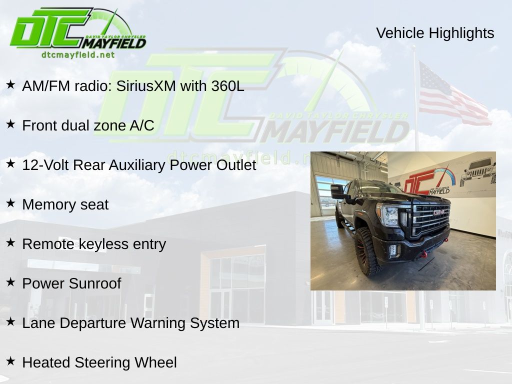 12-Volt Rear Auxiliary Power Outlet, 2 USB Ports (First Row), AM/FM radio: SiriusXM with 360L, Apple CarPlay/Android Auto, Front Bucket Seats, Front dual zone A/C, Heated Driver & Front Outboard Passenger Seats, Heated Steering Wheel, Hitch Guidance w/Hitch View, Lane Departure Warning System, Memory seat, Power Sunroof, Remote keyless entry, Ventilated Driver & Front Passenger Seats, Wi-Fi Hotspot Capable, 10-Way Power Driver Seat Adjuster w/Lumbar, 10-Way Power Passenger Seat Adjuster w/Lumbar, 120-Volt Bed Mounted Power Outlet, 120-Volt Instrument Panel Power Outlet, 18" Machined Aluminum Wheels, 2 USB Ports Inside Console, 2-Speed Active Transfer Case, 20" Machined Aluminum Wheels, 220 Amp Alternator, 2nd Row Dual USB Charge-Only Ports, 4-Wheel Disc Brakes, 4.2" Diagonal Color Display Driver Info Center, 6 Speakers, 6-Speaker Audio System Feature, ABS brakes, Air Conditioning, Alloy wheels, AT4 Preferred Package, Auto-dimming door mirrors, Auto-dimming Rear-View mirror, Automatic Emergency Braking, Automatic temperature control, Bed View Camera w/2 Trailer Camera Provisions, Bose Premium 7 Speaker Sound System, Brake assist, Bumpers: body-color, Compass, Compass Located In Instrument Cluster, Deep-Tinted Glass, Delay-off headlights, Driver Alert Package I, Driver Alert Package II, Driver door bin, Driver Memory, Driver vanity mirror, Dual front impact airbags, Dual front side impact airbags, Electric Rear-Window Defogger, Electrical Lock Control Steering Column, Electronic Stability Control, Engine Block Heater, Exhaust Brake, Floor-Mounted Center Console, Following Distance Indicator, Forward Collision Alert, Front anti-roll bar, Front Center Armrest, Front fog lights, Front License Plate Kit, Front reading lights, Front wheel independent suspension, Fully automatic headlights, GMC Connected Access Capable, Gooseneck/5th Wheel Package, Gooseneck/5th Wheel Prep Package, HD Rear Vision Camera, HD Surround Vision w/2 Trailer View Camera Provisions, Heated 2nd Row Outboard Seats, Heated door mirrors, Heated front seats, Heated steering wheel, Heavy-Duty 80 Amp Battery, Hill Descent Control, Illuminated entry, In-Vehicle Trailering System App, Integrated Trailer Brake Controller, IntelliBeam Automatic High Beam On/Off, Keyless Open & Start, Lane Change Alert w/Side Blind Zone Alert, LED Cargo Area Lighting, LED Smoked Amber Roof Marker Lamps, Low tire pressure warning, Manual Tilt-Wheel/Telescoping Steering Column, Not Equip w/Heat & Vent Seat Cushion Blower Motor, Not Equipped w/Front & Rear Park Assist, Occupant sensing airbag, Off-Road Suspension, OnStar & GMC Connected Services Capable, Outside temperature display, Overhead airbag, Overhead console, Painted Blk Surround Grille w/High Gloss Blk Mesh, Panic alarm, Passenger door bin, Passenger vanity mirror, Perforated Leather-Appointed Front Seat Trim, Pickup Bed, Power Door Locks, Power door mirrors, Power driver seat, Power Front Passenger Windows w/Express Up/Down, Power Front Windows w/Driver Express Up/Down, Power passenger seat, Power Rear Windows w/Express Down, Power Sliding Rear Window w/Defogger, Power steering, Power windows, Preferred Equipment Group 4SB, Prem Front Floor Liners w/Removable Carpet Insert, Prem Rear Floor Liners w/Removable Carpet Insert, Premium audio system: Premium GMC Infotainment System, ProGrade Trailering System, Radio: AM/FM w/Prem GMC Infotainment System & Navi, Radio: AM/FM w/Premium GMC Infotainment System, Rear Cross Traffic Alert, Rear reading lights, Rear seat center armrest, Rear step bumper, Rear Wheelhouse Liners, Rear window defroster, Red Recovery Hooks, Remote Vehicle Starter System, Safety Alert Seat, Security system, SiriusXM w/360L, Speed control, Speed-sensing steering, Split folding rear seat, Spray-On Pickup Bed Liner w/AT4 Logo, Steering Wheel Audio Controls, Steering wheel mounted audio c
