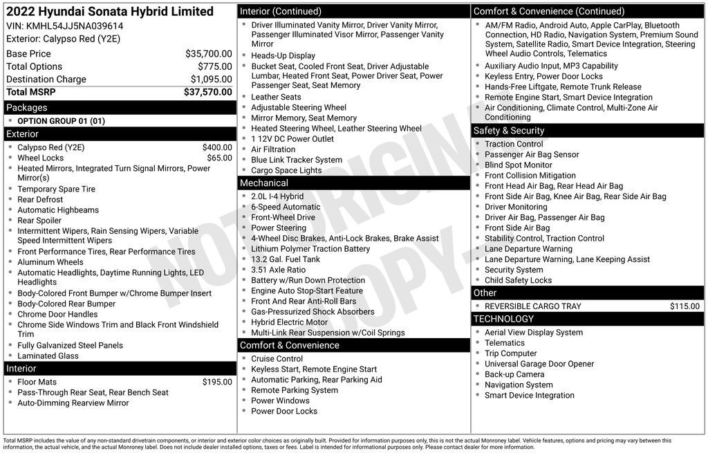 12 Speakers, 17" x 7.0J Aluminum Alloy Wheels, 4-Wheel Disc Brakes, ABS brakes, Air Conditioning, Alloy wheels, AM/FM radio: SiriusXM, Apple CarPlay & Android Auto, Auto High-beam Headlights, Auto-dimming Rear-View mirror, Automatic temperature control, Brake assist, Bumpers: body-color, Carpeted Floor Mats, Delay-off headlights, Driver door bin, Driver vanity mirror, Dual front impact airbags, Dual front side impact airbags, Electronic Stability Control, Emergency communication system: Blue Link Connected Car Service (3-year complimentary subscription), Four wheel independent suspension, Front anti-roll bar, Front Bucket Seats, Front Center Armrest, Front dual zone A/C, Front reading lights, Fully automatic headlights, Garage door transmitter: HomeLink, Heads-Up Display, Heated & Ventilated Front Bucket Seats, Heated door mirrors, Heated front seats, Heated steering wheel, Illuminated entry, Knee airbag, Lane Departure Warning System, Leather Seating Surfaces, Leather steering wheel, Low tire pressure warning, Memory seat, Navigation System, Occupant sensing airbag, Option Group 01, Outside temperature display, Overhead airbag, Overhead console, Panic alarm, Passenger door bin, Passenger vanity mirror, Power door mirrors, Power driver seat, Power passenger seat, Power steering, Power windows, Radio data system, Radio: AM/FM/SiriusXM/MP3 w/Navigation, Rain sensing wipers, Rear anti-roll bar, Rear seat center armrest, Rear side impact airbag, Rear window defroster, Remote keyless entry, Reversible Cargo Tray, Security system, Speed control, Speed-sensing steering, Speed-Sensitive Wipers, Split folding rear seat, Spoiler, Steering wheel mounted audio controls, Telescoping steering wheel, Tilt steering wheel, Traction control, Trip computer, Turn signal indicator mirrors, Variably intermittent wipers, Ventilated front seats, Wheel Locks.
