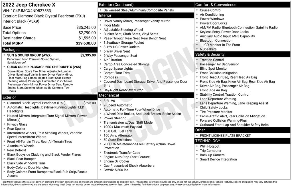 3.251 Final Drive Ratio, 4-Wheel Disc Brakes, 6 Speakers, ABS brakes, Air Conditioning, All-Season Floor Mats, Alloy wheels, AM/FM radio: SiriusXM, Anti-whiplash front head restraints, Apple CarPlay/Android Auto, Brake assist, Bumpers: body-color, Cherokee X, Cherokee X Door Decal, Cherokee X Fascia, Cherokee X Hood & Liftgate Decal, Cloth/Premium Vinyl Seats w/Pixel Play, Compass, Delay-off headlights, Driver door bin, Driver vanity mirror, Dual front impact airbags, Dual front side impact airbags, Electronic Stability Control, Four wheel independent suspension, Front anti-roll bar, Front Bucket Seats, Front Center Armrest, Front LED Fog Lamps, Front License Plate Bracket, Front reading lights, Fully automatic headlights, Gloss Black Badges, Gloss Black Exterior Accents, Gloss Black Grille Surrounds, Heated door mirrors, Heated Front Seats, Heated Steering Wheel, Illuminated entry, Knee airbag, Leather Wrapped Shift Knob, Light Tungsten Interior Accents, Low tire pressure warning, Matte Black Rear Tow Hook, Occupant sensing airbag, Off Road Suspension, Off Road Wheel Flares, Offroad Sill Cladding, Outside temperature display, Overhead airbag, Overhead console, Panic alarm, ParkView Rear Back-Up Camera, Passenger door bin, Passenger vanity mirror, Power Adjust 8-Way Driver Seat, Power door mirrors, Power Driver Lumbar Adjust, Power Front/Fixed Rear Full Sunroof, Power steering, Power windows, Premium Alpine Speaker System, Premium-Wrapped Steering Wheel, Quick Order Package 26S Cherokee X, Radio data system, Radio: Uconnect 4 w/8.4" Display, Rain sensing wipers, Rear anti-roll bar, Rear reading lights, Rear seat center armrest, Rear side impact airbag, Rear window defroster, Rear window wiper, Remote keyless entry, Remote Start System, Roof rack: rails only, Silver Anodized Interior Accents, Sliding Sun Visors w/Illuminated Mirrors, Speed control, Speed-sensing steering, Split folding rear seat, Spoiler, Steering Wheel Mounted Audio Controls, Sun & Sound Group, Tachometer, Telescoping steering wheel, Tilt steering wheel, Traction control, Trip computer, Turn signal indicator mirrors, Variably intermittent wipers, Voltmeter, Wheels: 17" x 7.5" Black Painted Aluminum, Windshield Wiper De-Icer.