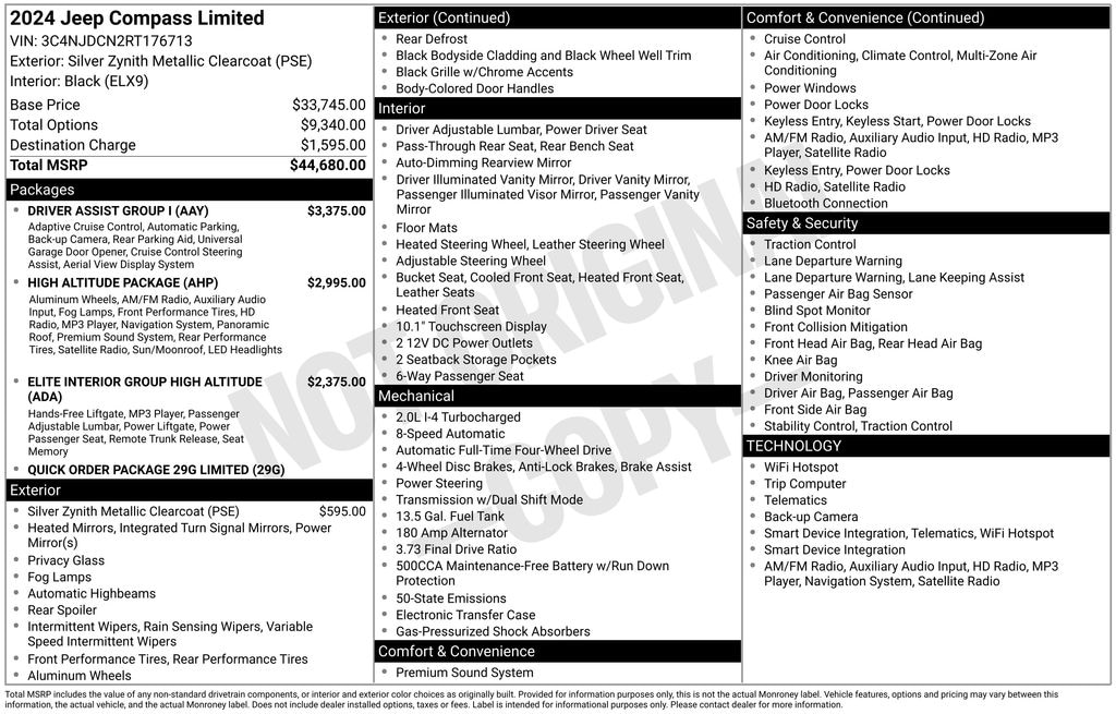 Compass Limited, 2.0L I4 DOHC, 8-Speed Automatic, 4WD, 10.1" Touchscreen Display, 2nd Row USB Type A/C Charge Only, 360 Surround View Camera System, 4G LTE Wi-Fi Hot Spot, Active Driving Assist System, Alexa Built-In, AM/FM radio: SiriusXM, Black Day Light Opening Moldings, Body Color Door Claddings, Body Color Exterior Sill Moldings, Body Color Fascias, Body Color Roof, Body Color Wheel Flares, Cluster 10.25" TFT Color Display, Connected Travel & Traffic Services, Disassociated Touchscreen Display, Driver Assist Group I, Driver Seat Memory, Elite Interior Group High Altitude, Foot Activated Open 'N Go Liftgate, For Details, Visit DriveUconnect.com, For More Info, Call 800-643-2112, Front dual zone A/C, Front fog lights, Global Telematics Box Module (TBM), Gloss Black Surround/Neutral Gray Rings, GPS Navigation, HD Radio, Heated front seats, Heated steering wheel, High Altitude Package, Integrated Voice Command w/Bluetooth, Leatherette Seats, LED Low/Highbeam Projector Headlamps, Liquid Chrome/Chainmail Hydro Accent, Neutral Gray Exterior Accents, Neutral Gray Exterior Badging, P&P Park & Unpark Assist System, ParkSense Fr/Rr Park Assist System, ParkView Rear Back-Up Camera, Power 2-Way Passenger Lumbar Adjust, Power 8-Way Adjust Front Passenger Seat, Power Front/Fixed Rear Full Sunroof, Power Liftgate, Premium Alpine Speaker System, Premium Leather Trimmed Bucket Seats, Premium LED Fog Lamps, Premium Taillamps, Quick Order Package 29G Limited, Radio: Uconnect 5 Nav w/10.1" Display, Remote keyless entry, Reversible Carpet/Vinyl Cargo Mat, SiriusXM Guardian - Included Trial (B), SiriusXM Radio Service, SiriusXM w/360L, Traffic Sign Recognition, Tungsten Accent Stitching, Universal Garage Door Opener, Ventilated Front Seats, Wheels: 19" x 7.5" Aluminum Painted, Wireless Charging Pad, 3.73 Final Drive Ratio, 4-Wheel Disc Brakes, 6 Speakers, ABS brakes, Air Conditioning, Alloy wheels, Auto High-beam Headlights, Auto-dimming Rear-View mirror, Automatic temperature control, Brake assist, Bumpers: body-color, Compass, Delay-off headlights, Driver door bin, Driver vanity mirror, Dual front impact airbags, Dual front side impact airbags, Electronic Stability Control, Emergency communication system: Jeep Connect, Four wheel independent suspension, Front anti-roll bar, Front Bucket Seats, Front Center Armrest w/Storage, Front reading lights, Fully automatic headlights, Heated door mirrors, Illuminated entry, Knee airbag, Leather Shift Knob, Leather steering wheel, Low tire pressure warning, Occupant sensing airbag, Outside temperature display, Overhead airbag, Overhead console, Panic alarm, Passenger door bin, Passenger vanity mirror, Power door mirrors, Power driver seat, Power steering, Power windows, Radio: Uconnect 5 w/10.1" Display, Rain sensing wipers, Rear anti-roll bar, Rear seat center armrest, Rear window defroster, Rear window wiper, Security system, Speed control, Split folding rear seat, Spoiler, Steering wheel mounted audio controls, Tachometer, Telescoping steering wheel, Tilt steering wheel, Traction control, Trip computer, Turn signal indicator mirrors, Variably intermittent wipers, Wheels: 18" x 7" Painted Diamond Cut Aluminum, Compass Limited, 2.0L I4 DOHC, 8-Speed Automatic, 4WD, 10.1" Touchscreen Display, 2nd Row USB Type A/C Charge Only, 360 Surround View Camera System, 4G LTE Wi-Fi Hot Spot, Active Driving Assist System, Alexa Built-In, AM/FM radio: SiriusXM, Black Day Light Opening Moldings, Body Color Door Claddings, Body Color Exterior Sill Moldings, Body Color Fascias, Body Color Roof, Body Color Wheel Flares, Cluster 10.25" TFT Color Display, Connected Travel & Traffic Services, Disassociated Touchscreen Display, Driver Assist Group I, Driver Seat Memory, Elite Interior Group High Altitude, Foot Activated Open 'N Go Liftgate, For Details, Visit DriveUconnect.com, For More In