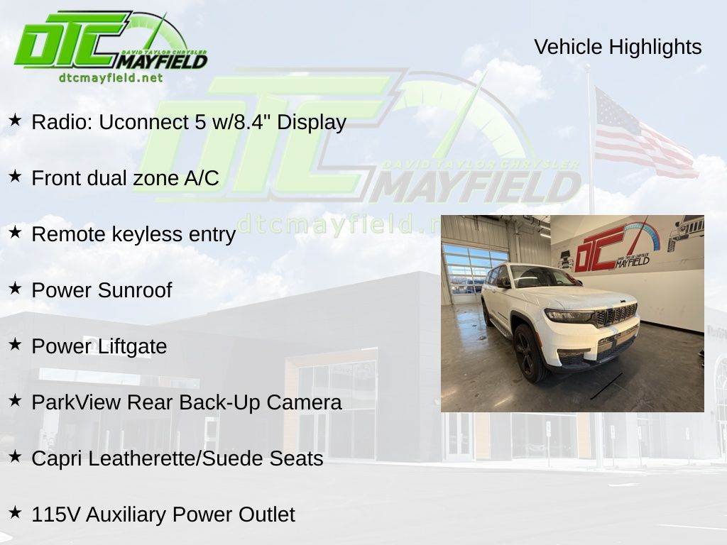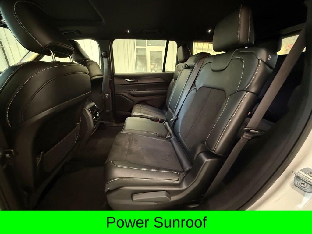 115V Auxiliary Power Outlet, 3rd Row Charge-Only USB Ports, Capri Leatherette/Suede Seats, Cloth Seats, Front Bucket Seats, Front dual zone A/C, Heated Steering Wheel, ParkView Rear Back-Up Camera, Power Liftgate, Power Sunroof, Radio: Uconnect 5 w/8.4" Display, Remote keyless entry, Wireless Charging Pad, 2nd Row 60/40 Bench w/Manual Tip/Slide, 2nd Row Seat Center Armrest/Cupholders, 3 Rear Seat Head Restraints, 3.45 Rear Axle Ratio, 3rd row seats: split-bench, 4-Wheel Disc Brakes, 6 Speakers, 7-Passenger Seating, ABS brakes, Air Conditioning, Alloy wheels, Altitude X, Anti-whiplash front head restraints, Automatic temperature control, Black Headliner, Brake assist, Bumpers: body-color, Center Rear 3-Point Seat Belt, Compass, Delay-off headlights, Delete Laredo Badge, Driver door bin, Driver vanity mirror, Dual front impact airbags, Dual front side impact airbags, Electronic Stability Control, Emergency communication system, Four wheel independent suspension, Front anti-roll bar, Front Center Armrest w/Storage, Front reading lights, Fully automatic headlights, Gloss Black Exterior Accents, Heated door mirrors, Heated Front Seats, Illuminated entry, Knee airbag, Low tire pressure warning, Manual Fold Seatbacks, MOPAR Bright Side Steps, MOPAR Finishing Package, MOPAR Front Splash Guards, MOPAR Paint Protection Film, MOPAR Rear Splash Guards w/Jeep Logo, Normal Duty Suspension, Occupant sensing airbag, Outside temperature display, Overhead airbag, Overhead console, Panic alarm, Passenger door bin, Passenger vanity mirror, Power door mirrors, Power driver seat, Power steering, Power windows, Quick Order Package 23M Altitude X, Radio data system, Rain Sensitive Windshield Wipers, Rear air conditioning, Rear anti-roll bar, Rear reading lights, Rear window defroster, Rear window wiper, Reclining 3rd row seat, Remote Start System, Security system, Selectable Tire Fill Alert, Speed control, Speed-Sensitive Wipers, Split folding rear seat, Spoiler, Steering wheel mounted audio controls, Tachometer, Telescoping steering wheel, Tilt steering wheel, Traction control, Trip computer, Variably intermittent wipers, Voltmeter, Wheels: 18" x 8.0" Fully Painted Aluminum, Wheels: 18" x 8.0" Fully Painted Aluminum 1, Wheels: 20" x 8.5" Gloss Black Painted Aluminum, 115V Auxiliary Power Outlet, 3rd Row Charge-Only USB Ports, Capri Leatherette/Suede Seats, Cloth Seats, Front Bucket Seats, Front dual zone A/C, Heated Steering Wheel, ParkView Rear Back-Up Camera, Power Liftgate, Power Sunroof, Radio: Uconnect 5 w/8.4" Display, Remote keyless entry, Wireless Charging Pad.
