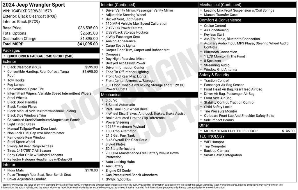 Wrangler Sport, 3.6L V6 24V VVT, 8-Speed Automatic, 4WD, Air Conditioning, AM/FM radio, Apple CarPlay/Android Auto, Brake assist, Cloth Low-Back Bucket Seats, Electronic Stability Control, Front fog lights, ParkView Rear Back-Up Camera, Quick Order Package 24B Sport, Rear Window Wiper/Washer, Wheels: 17" x 7.5" Black Steel Styled, 110 MPH Vehicle Max Speed Calibration, 3.45 Overall Top Gear Ratio, 4-Wheel Disc Brakes, 8 Speakers, ABS brakes, Aux Battery, Black 3-Piece Hard Top, Compass, Delay-off headlights, Driver door bin, Driver vanity mirror, Dual front impact airbags, Dual front side impact airbags, Freedom Panel Storage Bag, Front anti-roll bar, Front Bucket Seats, Front Center Armrest w/Storage, Front reading lights, Integrated roll-over protection, Low tire pressure warning, MOPAR All-Weather Floor Mats, Mopar Black Fuel Filler Door, No Soft Top, Non-Lock Fuel Cap w/o Discriminator, Normal Duty Suspension, Occupant sensing airbag, Outside temperature display, Overhead airbag, Passenger door bin, Passenger vanity mirror, Power steering, Radio data system, Radio: Uconnect 5 w/12.3" Display, Rear anti-roll bar, Rear reading lights, Rear Window Defroster, Speed control, Split folding rear seat, Steering wheel mounted audio controls, Stop-Start Dual Battery System, Tachometer, Telescoping steering wheel, Tilt steering wheel, Traction control, Trip computer, Variably intermittent wipers, Wrangler Sport, 3.6L V6 24V VVT, 8-Speed Automatic, 4WD, Air Conditioning, AM/FM radio, Apple CarPlay/Android Auto, Brake assist, Cloth Low-Back Bucket Seats, Electronic Stability Control, Front fog lights, ParkView Rear Back-Up Camera, Quick Order Package 24B Sport, Rear Window Wiper/Washer, Wheels: 17" x 7.5" Black Steel Styled.