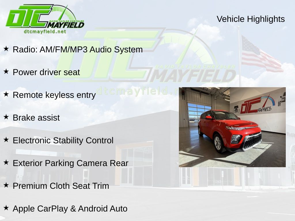 Soul S, 2.0L I4 MPI DOHC 16V LEV3-SULEV30 147hp, CVT, FWD, Apple CarPlay & Android Auto, Brake assist, Electronic Stability Control, Exterior Parking Camera Rear, Front Bucket Seats, Power driver seat, Premium Cloth Seat Trim, Radio: AM/FM/MP3 Audio System, Remote keyless entry, Wheels: 16" x 6.5 Alloy, 4-Wheel Disc Brakes, 6 Speakers, ABS brakes, Air Conditioning, Alloy wheels, AM/FM radio, Bumpers: body-color, Carpeted Floor Mats, Delay-off headlights, Driver door bin, Driver vanity mirror, Dual front impact airbags, Dual front side impact airbags, Front anti-roll bar, Front Center Armrest, Front reading lights, Front wheel independent suspension, Fully automatic headlights, Low tire pressure warning, Occupant sensing airbag, Outside temperature display, Overhead airbag, Overhead console, Passenger door bin, Passenger vanity mirror, Power door mirrors, Power steering, Power windows, Rear window defroster, Rear window wiper, Speed control, Speed-sensing steering, Split folding rear seat, Steering wheel mounted audio controls, Tachometer, Telescoping steering wheel, Tilt steering wheel, Traction control, Trip computer, Variably intermittent wipers, Soul S, 2.0L I4 MPI DOHC 16V LEV3-SULEV30 147hp, CVT, FWD, Apple CarPlay & Android Auto, Brake assist, Electronic Stability Control, Exterior Parking Camera Rear, Front Bucket Seats, Power driver seat, Premium Cloth Seat Trim, Radio: AM/FM/MP3 Audio System, Remote keyless entry, Wheels: 16" x 6.5 Alloy.