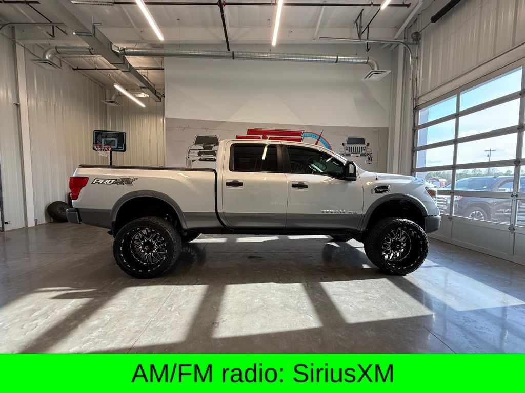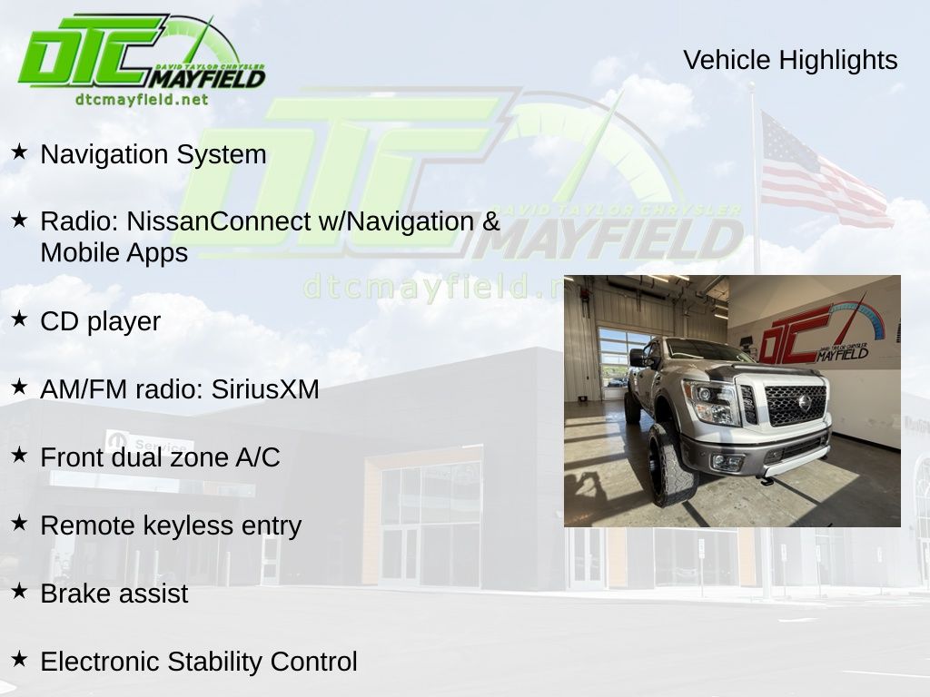 AM/FM radio: SiriusXM, Brake assist, CD player, Electronic Stability Control, Front Bucket Seats, Front dual zone A/C, Front fog lights, Illuminated entry, Navigation System, Radio: NissanConnect w/Navigation & Mobile Apps, Remote keyless entry, Stain Resistant Cloth Seat Trim w/Vinyl Bolsters, Wheels: 18" x 7.5" Painted Dark Finish Alloy, 3.357 Axle Ratio, 4-Wheel Disc Brakes, 6 Speaker System, 6 Speakers, 6.5' TITAN Box w/New Cleat, ABS brakes, Air Conditioning, Alloy wheels, Automatic temperature control, Delay-off headlights, Driver door bin, Driver vanity mirror, Dual front impact airbags, Dual front side impact airbags, Electronic Locking Tailgate, Front anti-roll bar, Front Captain's Chairs, Front Center Armrest, Front reading lights, Front wheel independent suspension, Heated door mirrors, Leather steering wheel, LED Fog Lights w/Bright Chrome Bezel, Low tire pressure warning, Outside temperature display, Overhead airbag, Overhead console, Panic alarm, Passenger door bin, Passenger vanity mirror, Power door mirrors, Power driver seat, Power steering, Power windows, PRO-4X Utility Package, Radio data system, Rain sensing wipers, Rear anti-roll bar, Rear seat center armrest, Rear step bumper, Rear Utility Bed Step, Rear window defroster, Rockford Fosgate Premium Audio w/12 Speakers, Security system, Siri Eyes Free, Speed control, Speed-sensing steering, Speed-Sensitive Wipers, Splash Guards, Split folding rear seat, Steering wheel mounted audio controls, Tachometer, Telescoping steering wheel, Tilt steering wheel, TITAN Box, Traction control, Turn signal indicator mirrors, Variably intermittent wipers, Voltmeter, AM/FM radio: SiriusXM, Brake assist, CD player, Electronic Stability Control, Front Bucket Seats, Front dual zone A/C, Front fog lights, Illuminated entry, Navigation System, Radio: NissanConnect w/Navigation & Mobile Apps, Remote keyless entry, Stain Resistant Cloth Seat Trim w/Vinyl Bolsters, Wheels: 18" x 7.5" Painted Dark Finish Alloy.