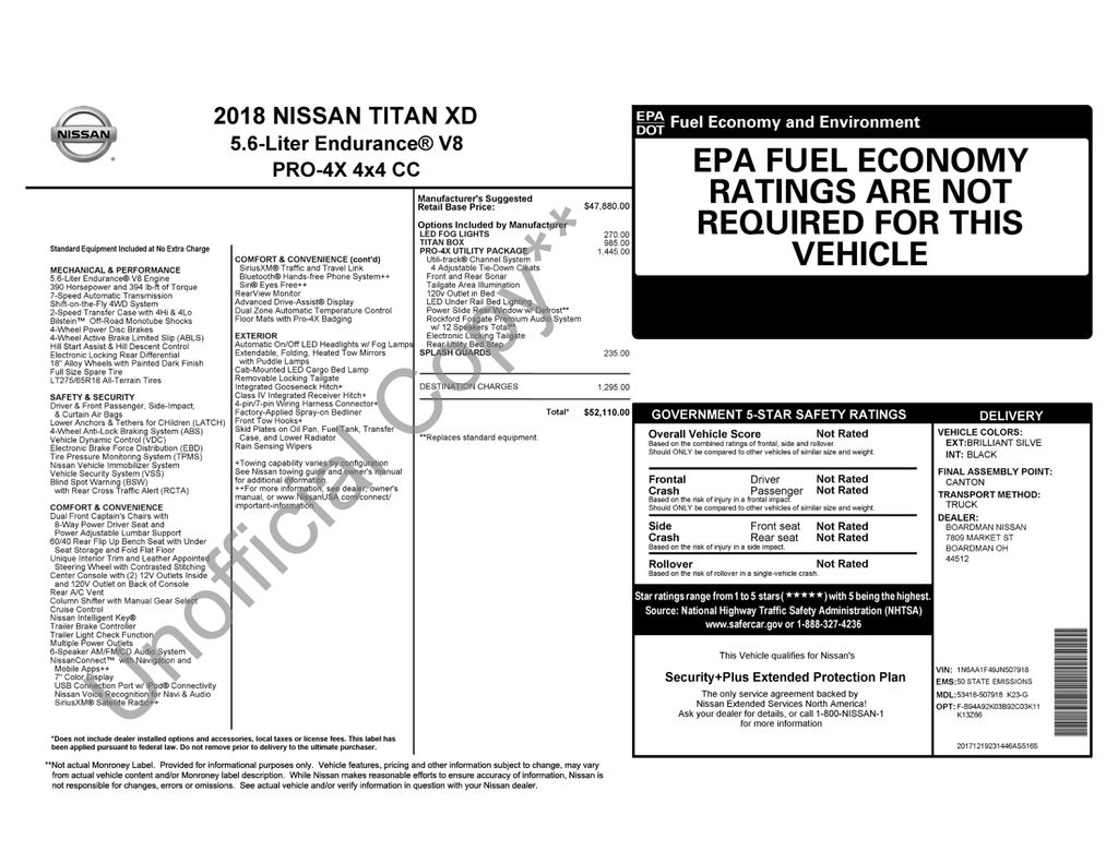 3.357 Axle Ratio, 4-Wheel Disc Brakes, 6 Speaker System, 6 Speakers, 6.5' TITAN Box w/New Cleat, ABS brakes, Air Conditioning, Alloy wheels, AM/FM radio: SiriusXM, Automatic temperature control, Brake assist, CD player, Delay-off headlights, Driver door bin, Driver vanity mirror, Dual front impact airbags, Dual front side impact airbags, Electronic Locking Tailgate, Electronic Stability Control, Front anti-roll bar, Front Bucket Seats, Front Captain's Chairs, Front Center Armrest, Front dual zone A/C, Front fog lights, Front reading lights, Front wheel independent suspension, Heated door mirrors, Illuminated entry, Leather steering wheel, LED Fog Lights w/Bright Chrome Bezel, Low tire pressure warning, Navigation System, Outside temperature display, Overhead airbag, Overhead console, Panic alarm, Passenger door bin, Passenger vanity mirror, Power door mirrors, Power driver seat, Power steering, Power windows, PRO-4X Utility Package, Radio data system, Radio: NissanConnect w/Navigation & Mobile Apps, Rain sensing wipers, Rear anti-roll bar, Rear seat center armrest, Rear step bumper, Rear Utility Bed Step, Rear window defroster, Remote keyless entry, Rockford Fosgate Premium Audio w/12 Speakers, Security system, Speed control, Speed-sensing steering, Speed-Sensitive Wipers, Splash Guards, Split folding rear seat, Stain Resistant Cloth Seat Trim w/Vinyl Bolsters, Steering wheel mounted audio controls, Tachometer, Telescoping steering wheel, Tilt steering wheel, TITAN Box, Traction control, Turn signal indicator mirrors, Variably intermittent wipers, Voltmeter, Wheels: 18" x 7.5" Painted Dark Finish Alloy.