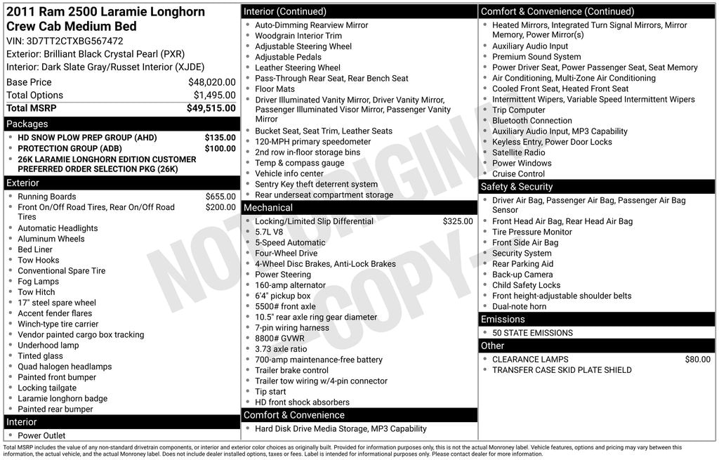 10 Speakers, 115V Auxiliary Power Outlet, 17" x 8" Aluminum Wheels, 180 Amp Alternator, 3.73 Rear Axle Ratio, 30GB HDD w/4,250-Song Capacity, 4-Wheel Disc Brakes, 6.5" Touch Screen Display, ABS brakes, Adjustable pedals, Air Conditioning, Alloy wheels, AM/FM radio: SIRIUS, Anti-Spin Differential Rear Axle, Audio Jack Input for Mobile Devices, Audio memory, Auto-dimming door mirrors, Auto-dimming Rear-View mirror, Automatic temperature control, CD player, Center Hub, Chrome Exterior Mirrors, Chrome Power Trailer Tow Mirrors, Clearance Lamps, Compass, Delay-off headlights, Driver door bin, Driver vanity mirror, Dual front impact airbags, DVD-Audio, Exterior Mirrors Courtesy Lamps, Exterior Mirrors w/Heating Element, Exterior Mirrors w/Memory, Exterior Mirrors w/Supplemental Signals, Exterior Parking Camera Rear, Front anti-roll bar, Front Bucket Seats, Front Center Armrest w/Storage, Front dual zone A/C, Front fog lights, Front reading lights, Fully automatic headlights, Garage door transmitter, Genuine wood dashboard insert, Genuine wood door panel insert, HD Snow Plow Prep Group, Heated door mirrors, Heated Front Seats, Heated front seats, Heated rear seats, Heated Second Row Seats, Heated steering wheel, Illuminated entry, Leather steering wheel, Low Back Bucket Seats, Low tire pressure warning, Media Center 430N CD/DVD/MP3/HDD/Navigation, Memory seat, Mopar Chrome Tubular Side Steps, Navigation system: Garmin, Occupant sensing airbag, Outside temperature display, Overhead airbag, Overhead console, Panic alarm, Passenger door bin, Passenger vanity mirror, Pedal memory, Power 10-Way Memory Driver & 6-Way Passenger Seats, Power door mirrors, Power driver seat, Power Lumbar Adjust, Power passenger seat, Power steering, Power windows, Premium Leather Bucket Seats, Protection Group, Quick Order Package 26K Laramie Longhorn Edition, Radio data system, Rear 60/40 Split Folding Seat, Rear Parking Sensors, Rear seat center armrest, Rear step bumper, Remote keyless entry, Security system, SIRIUS Travel Link, Speed control, Split folding rear seat, Steering wheel mounted audio controls, Tachometer, Tilt steering wheel, Trip computer, Turn signal indicator mirrors, Uconnect Voice Command w/Bluetooth, USB Port For Mobile Devices, Variably intermittent wipers, Ventilated Front Seats, Ventilated front seats, Voltmeter.