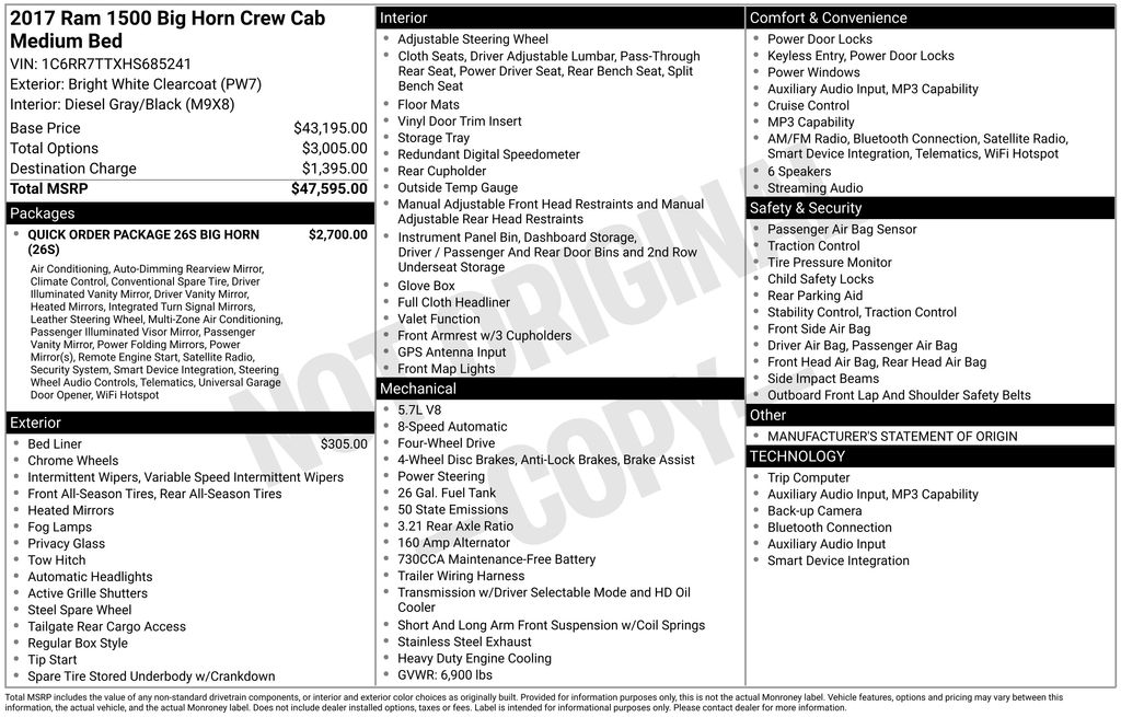 115V Auxiliary Power Outlet, Air Conditioning ATC w/Dual Zone Control, AM/FM radio, Class IV Receiver Hitch, Integrated Voice Command w/Bluetooth, Media Hub (USB, AUX), ParkSense Front/Rear Park Assist System, ParkView Rear Back-Up Camera, Premium Cloth 40/20/40 Bench Seat, Radio: Uconnect 3C w/8.4" Display, Remote keyless entry, Remote USB Port, SIRIUSXM Satellite Radio, 17" x 7" Aluminum Wheels, 3.21 Rear Axle Ratio, 4-Wheel Disc Brakes, 40/20/40 Split Bench Seat, 6 Month Trial (Reg. Required), 6 Month Trial (Registration Required), 6 Speakers, 8.4" Touchscreen Display, ABS brakes, Active Grille Shutters, Air Conditioning, Alloy wheels, Audio Jack Input for Mobile Devices, Auto-Dimming Exterior Mirrors, Auto-Dimming Rear-View Mirror, Big Horn Badge, Big Horn Regional Package, Black Exterior Mirrors, Black Rotary Shifter, Brake assist, Bright/Bright Billets Grille, Bumpers: chrome, Center Hub, Charge Only Remote USB Port, Cloth 40/20/40 Bench Seat, Compass, Delay-off headlights, Driver door bin, Dual front impact airbags, Dual front side impact airbags, Dual Rear Exhaust w/Bright Tips, Electric Shift-On-Demand Transfer Case, Electroluminescent Instrument Cluster, Electronic Shift, Electronic Stability Control, Electronically Controlled Throttle, Engine Oil Heat Exchanger, Exterior Mirrors Courtesy Lamps, Exterior Mirrors w/Heating Element, Exterior Mirrors w/Supplemental Signals, Fog Lamps, Folding Flat Load Floor Storage, For Details Visit DriveUconnect.com, Front anti-roll bar, Front Armrest w/3 Cupholders, Front Center Armrest w/Storage, Front Center Seat Cushion Storage, Front reading lights, Front wheel independent suspension, Fully automatic headlights, Glove Box Lamp, GPS Antenna Input, Heated door mirrors, Heavy-Duty Engine Cooling, Hemi Badge, Illuminated entry, Leather Wrapped Steering Wheel, LED Bed Lighting, Low tire pressure warning, Manufacturer's Statement of Origin, Nav-Capable! See Dealer for Details, Occupant sensing airbag, Outside temperature display, Overhead airbag, Overhead console, Overhead Console w/Garage Door Opener, Panic alarm, Passenger door bin, Passenger vanity mirror, Power 10-Way Driver Seat, Power door mirrors, Power Heated Fold-Away Mirrors, Power Lumbar Adjust, Power steering, Power windows, Power-Folding Mirrors, Quick Order Package 26S Big Horn, Radio data system, Radio: Uconnect 3 w/5" Display, Rear 60/40 Split Folding Seat, Rear anti-roll bar, Rear Dome w/On/Off Switch Lamp, Rear seat center armrest, Rear step bumper, Remote Start System, Security Alarm, Speed control, Steering Wheel Mounted Audio Controls, Storage Tray, Sun Visors w/Illuminated Vanity Mirrors, Tachometer, Tilt steering wheel, Tip Start, Traction control, Trip computer, Uconnect Access, Underhood Lamp, Universal Garage Door Opener, Variably intermittent wipers, Voltmeter, Wheels: 20" x 8" Aluminum Chrome Clad, 115V Auxiliary Power Outlet, Air Conditioning ATC w/Dual Zone Control, AM/FM radio, Class IV Receiver Hitch, Integrated Voice Command w/Bluetooth, Media Hub (USB, AUX), ParkSense Front/Rear Park Assist System, ParkView Rear Back-Up Camera, Premium Cloth 40/20/40 Bench Seat, Radio: Uconnect 3C w/8.4" Display, Remote keyless entry, Remote USB Port, SIRIUSXM Satellite Radio.