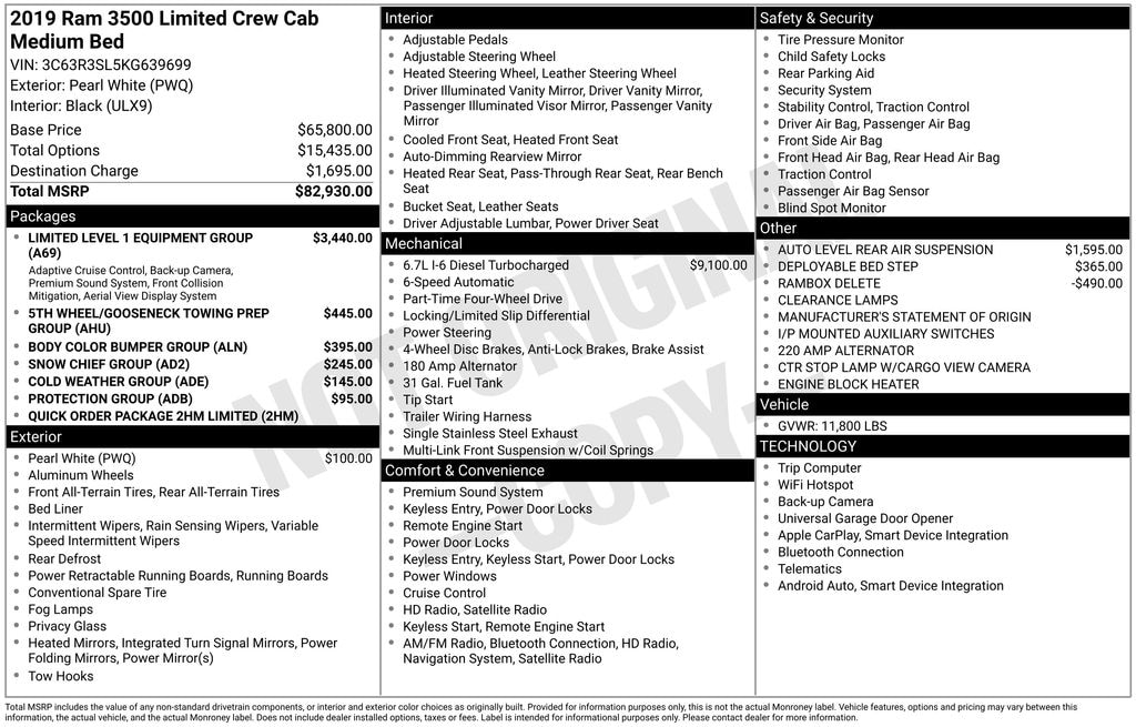 1-Year SiriusXM Guardian Trial, 10 Speakers, 12" Touchscreen Display, 17 Speaker High Performance Audio, 220 Amp Alternator, 3.73 Axle Ratio, 4-Wheel Disc Brakes, 5th Wheel/Gooseneck Towing Prep Group, ABS brakes, Active Noise Control System, Adaptive Cruise Control w/Stop, Adjustable pedals, Air Conditioning, Alloy wheels, AM/FM radio: SiriusXM with 360L, Apple CarPlay, Apple CarPlay/Android Auto, Audio memory, Auto High-beam Headlights, Auto Level Rear Air Suspension, Auto-dimming Rear-View mirror, Automatic temperature control, Body Color Bumper Group, Bodyside moldings, Brake assist, Bumpers: chrome, Clearance Lamps, Cold Weather Group, Compass, CTR Stop Lamp w/Cargo View Camera, Delay-off headlights, Deployable Bed Step, Disassociated Touchscreen Display, Driver door bin, Driver vanity mirror, Dual front impact airbags, Dual front side impact airbags, Electronic Stability Control, Electronically Controlled Throttle, Emergency communication system: SiriusXM Guardian, Engine Block Heater, Front anti-roll bar, Front Bucket Seats, Front Center Armrest w/Storage, Front dual zone A/C, Front fog lights, Front reading lights, Full Speed Forward Collision Warning Plus, Fully automatic headlights, Garage door transmitter, Genuine wood console insert, Genuine wood dashboard insert, Genuine wood door panel insert, Google Android Auto, GPS Antenna Input, GPS Navigation, HD Radio, Heated door mirrors, Heated front seats, Heated rear seats, Heated steering wheel, I/P Mounted Auxiliary Switches, Illuminated entry, Integrated Voice Command w/Bluetooth, Leather steering wheel, Limited Leather Bucket Seats, Limited Level 1 Equipment Group, Low tire pressure warning, Manufacturer's Statement of Origin, Memory seat, Navigation System, Occupant sensing airbag, Outside temperature display, Overhead airbag, Overhead console, Painted Front Bumper, Painted Rear Bumper, Panic alarm, ParkView Rear Back-Up Camera, Passenger door bin, Passenger vanity mirror, Pedal memory, Power door mirrors, Power driver seat, Power passenger seat, Power steering, Power windows, Protection Group, Quick Order Package 2HM Limited, Radio data system, Radio: Uconnect 12.0 w/Navigation, Rain sensing wipers, RamBox Cargo Management System, RamBox Delete, Rear reading lights, Rear seat center armrest, Rear step bumper, Rear window defroster, Remote CD player, Remote keyless entry, Security system, SiriusXM Satellite Radio, SiriusXM Traffic Plus, SiriusXM Travel Link, SiriusXM w/360L, Snow Chief Group, Speed control, Split folding rear seat, Steering wheel mounted audio controls, Surround View Camera System, Tachometer, Tilt steering wheel, Tip Start, Traction control, Trailer Reverse Guidance, Trip computer, Turn signal indicator mirrors, USB Host Flip, Variably intermittent wipers, Ventilated front seats, Voltmeter, Wheels: 20" x 8.0" Satin Carbon w/Chrome Insert, Winter Front Grille Cover.