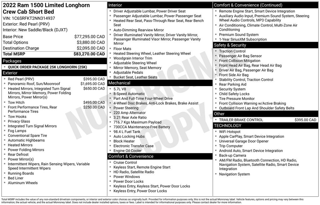 #1 Seat Foam Cushion, 10 Speakers, 3 Rear Seat Head Restraints, 3.21 Rear Axle Ratio, 4 Way Front Headrests, 4-Wheel Disc Brakes, 48V Belt Starter Generator, 4G LTE Wi-Fi Hot Spot, ABS brakes, Adjustable pedals, Air Conditioning, Alloy wheels, AM/FM radio: SiriusXM, Apple CarPlay, Apple CarPlay/Android Auto, Audio memory, Auto High-beam Headlights, Auto-dimming door mirrors, Auto-dimming Rear-View mirror, Automatic temperature control, Brake assist, Bucket Seats, Bumpers: chrome, Chrome Exterior Mirrors, Chrome Power-Fold Trailer Tow Mirrors, Compass, Connected Travel & Traffic Services, Connectivity - US/Canada, Delay-off headlights, Disassociated Touchscreen Display, Dome Dual LED Reading Lamp, Driver door bin, Driver Seat Memory, Driver vanity mirror, Dual front impact airbags, Dual front side impact airbags, Dual-Pane Panoramic Sunroof, Electronic Stability Control, Exterior Mirrors Courtesy Lamps, Exterior Mirrors w/Heating Element, Exterior Mirrors w/Memory, Exterior Mirrors w/Supplemental Signals, For Details, Visit DriveUconnect.com, Front anti-roll bar, Front Bucket Seats, Front Center Armrest w/Storage, Front dual zone A/C, Front fog lights, Front reading lights, Front Seat Back Map Pockets, Front wheel independent suspension, Full Length Premium Floor Console, Fully automatic headlights, Garage door transmitter, Genuine wood console insert, Genuine wood dashboard insert, Genuine wood door panel insert, Global Telematics Box Module (TBM), Google Android Auto, GPS Antenna Input, GPS Navigation, HD Radio, Heated door mirrors, Heated Front Seats, Heated front seats, Heated rear seats, Heated Second Row Seats, Heated Steering Wheel, Heated steering wheel, Illuminated entry, Integrated Center Stack Radio, Integrated Voice Command w/Bluetooth, Leather steering wheel, Leather Trimmed Bucket Seats, LED Dome/Reading Lamp, Low tire pressure warning, Memory seat, Mirror Clearance/Running Lights, Mirror-Mounted Aux Reverse Lamps, Navigation System, Occupant sensing airbag, Outside temperature display, Overhead airbag, Overhead console, Panic alarm, ParkView Rear Back-Up Camera, Passenger door bin, Passenger vanity mirror, Pedal memory, Power 4-Way Driver Lumbar Adjust, Power 4-Way Passenger Lumbar Adjust, Power 8-Way Driver & Passenger Seats, Power door mirrors, Power driver seat, Power passenger seat, Power steering, Power windows, Power-Folding Mirrors, Quick Order Package 25K Longhorn, Radio data system, Radio: Uconnect 5 Nav w/8.4" Display, Rain sensing wipers, Rear 60/40 Folding Split Recline Seat, Rear anti-roll bar, Rear seat center armrest, Rear step bumper, Rear window defroster, Remote keyless entry, Security system, SiriusXM Radio Service, SiriusXM w/360L, Speed control, Split folding rear seat, Steering wheel mounted audio controls, Tachometer, Telescoping steering wheel, Tilt steering wheel, Traction control, Trailer Brake Control, Trailer Tow Mirrors, Trip computer, Turn signal indicator mirrors, USB Host Flip, Variably intermittent wipers, Ventilated Front Seats, Ventilated front seats, Voltmeter, Wheels: 20" x 9" Aluminum Painted/Polished.