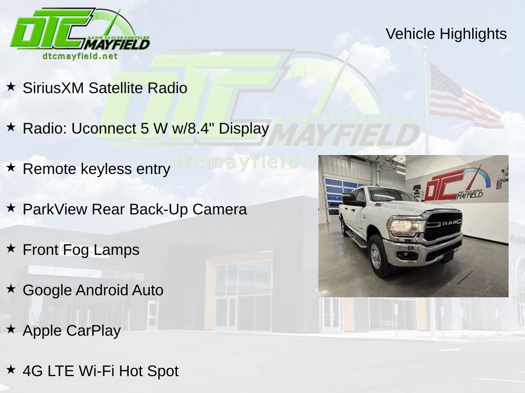 4G LTE Wi-Fi Hot Spot, Apple CarPlay, Front Fog Lamps, Google Android Auto, Integrated Voice Command w/Bluetooth, ParkView Rear Back-Up Camera, Premium Cloth 40/20/40 Bench Seat, Radio: Uconnect 5 W w/8.4" Display, Remote keyless entry, SiriusXM Satellite Radio, Tow Hooks, 2 Way Rear Headrest Seat, 220 Amp Alternator, 2nd Row In Floor Storage Bins, 3.73 Axle Ratio, 4 Way Front Headrests, 4-Wheel Disc Brakes, 40/20/40 Split Bench Seat, 6 Speakers, 8.4" Touchscreen Display, ABS brakes, Active Noise Control System, Air Conditioning, Alloy wheels, Auto Power-Folding Mirrors, Auto-dimming Rear-View mirror, Black Exterior Mirrors, Bluetooth Handsfree Phone & Audio, Brake assist, Bumpers: chrome, Center Hub, Center Stack Storage Drawer, Chrome Flat Cab-Length Side Steps, Cloth 40/20/40 Bench Seat, Cold Weather Group, Compass, Connectivity - US/Canada, Delay-off headlights, Driver door bin, Dual front impact airbags, Dual front side impact airbags, Dual Glove Boxes, Electronic Stability Control, Electronically Controlled Throttle, Emergency communication system: SiriusXM Guardian, Engine Block Heater, Exterior Mirrors Courtesy Lamps, Exterior Mirrors w/Heating Element, Exterior Mirrors w/Supplemental Signals, Foam Bottle Insert (Door Trim Panel), Footwell Courtesy Lamp, For Details, Visit DriveUconnect.com, For More Info, Call 800-643-2112, Forward & Reverse Utility Lights, Front anti-roll bar, Front Armrest w/Cupholders, Front Center Armrest w/Storage, Front Center Seat Cushion Storage, Front License Plate Bracket, Front reading lights, Front Seat Back Map Pockets, Fully automatic headlights, Global Telematics Box Module (TBM), Glove Box Lamp, GPS Antenna Input, Heated door mirrors, Heavy Duty Snow Plow Prep Group, Illuminated entry, Integrated Center Stack Radio, Leather Wrapped Steering Wheel, Level 1 Equipment Group, Level 1 Equipment Group w/2_Y, Locking Lower Glove Box, Lone Star IP Badge, Low tire pressure warning, Manual Adjust 4-Way Driver Seat, Manual Adjust 4-Way Front Passenger Seat, Manufacturer's Statement of Origin, Mirror Running Lights, MOPAR Front & Rear Rubber Floor Mats, MOPAR Spray In Bedliner, MOPAR Winter Front Grille Cover, Occupant sensing airbag, Outside temperature display, Overhead airbag, Overhead console, Panic alarm, ParkSense Front/Rear Park Assist System, Passenger door bin, Passenger vanity mirror, Power 2-Way Driver Lumbar Adjust, Power Adjust 8-Way Driver Seat, Power Adjust Mirrors, Power Adjustable Convex Aux Mirrors, Power door mirrors, Power Heated Fold Telescope Mirrors, Power steering, Power Telescoping Mirrors, Power windows, Quick Order Package 2HZ Big Horn, Radio data system, Radio: Uconnect 3 w/5" Display, Rear 60/40 Folding Seat, Rear anti-roll bar, Rear Dome w/On/Off Switch Lamp, Rear Folding Seat, Rear seat center armrest, Rear step bumper, Rear Window Defroster, Selectable Tire Fill Alert, SiriusXM Radio Service, Speed control, Steering Wheel Mounted Audio Controls, Storage Tray, Tachometer, Tilt steering wheel, Tip Start, Traction control, Trip computer, Turn signal indicator mirrors, Variably intermittent wipers, Voltmeter, Wheels: 18" x 8.0" Polished Aluminum, 4G LTE Wi-Fi Hot Spot, Apple CarPlay, Front Fog Lamps, Google Android Auto, Integrated Voice Command w/Bluetooth, ParkView Rear Back-Up Camera, Premium Cloth 40/20/40 Bench Seat, Radio: Uconnect 5 W w/8.4" Display, Remote keyless entry, SiriusXM Satellite Radio, Tow Hooks.