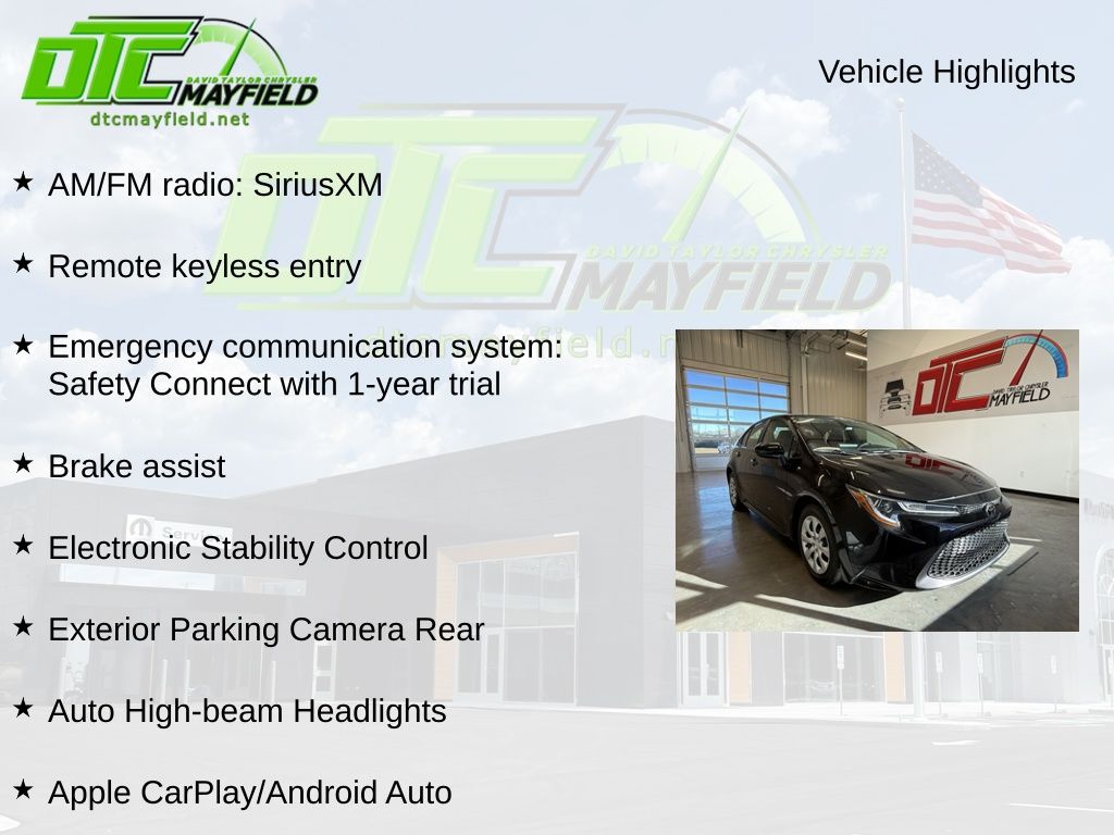 Corolla LE, 1.8L I4 DOHC 16V, CVT, FWD, AM/FM radio: SiriusXM, Apple CarPlay/Android Auto, Auto High-beam Headlights, Brake assist, Electronic Stability Control, Emergency communication system: Safety Connect with 1-year trial, Exterior Parking Camera Rear, Front Bucket Seats, Remote keyless entry, Wheels: 16" Wide Vent Steel, 4-Wheel Disc Brakes, 6 Speakers, ABS brakes, Air Conditioning, Automatic temperature control, Bumpers: body-color, Delay-off headlights, Driver door bin, Driver vanity mirror, Dual front impact airbags, Dual front side impact airbags, Four wheel independent suspension, Front anti-roll bar, Front Center Armrest, Front reading lights, Fully automatic headlights, Illuminated entry, Knee airbag, Low tire pressure warning, Occupant sensing airbag, Outside temperature display, Overhead airbag, Panic alarm, Passenger door bin, Passenger vanity mirror, Power door mirrors, Power steering, Power windows, Premium Fabric Seat Trim, Radio data system, Radio: Audio, Rear anti-roll bar, Rear seat center armrest, Rear side impact airbag, Rear window defroster, Security system, Speed control, Split folding rear seat, Steering wheel mounted audio controls, Tachometer, Telescoping steering wheel, Tilt steering wheel, Traction control, Trip computer, Variably intermittent wipers, Corolla LE, 1.8L I4 DOHC 16V, CVT, FWD, AM/FM radio: SiriusXM, Apple CarPlay/Android Auto, Auto High-beam Headlights, Brake assist, Electronic Stability Control, Emergency communication system: Safety Connect with 1-year trial, Exterior Parking Camera Rear, Front Bucket Seats, Remote keyless entry, Wheels: 16" Wide Vent Steel.